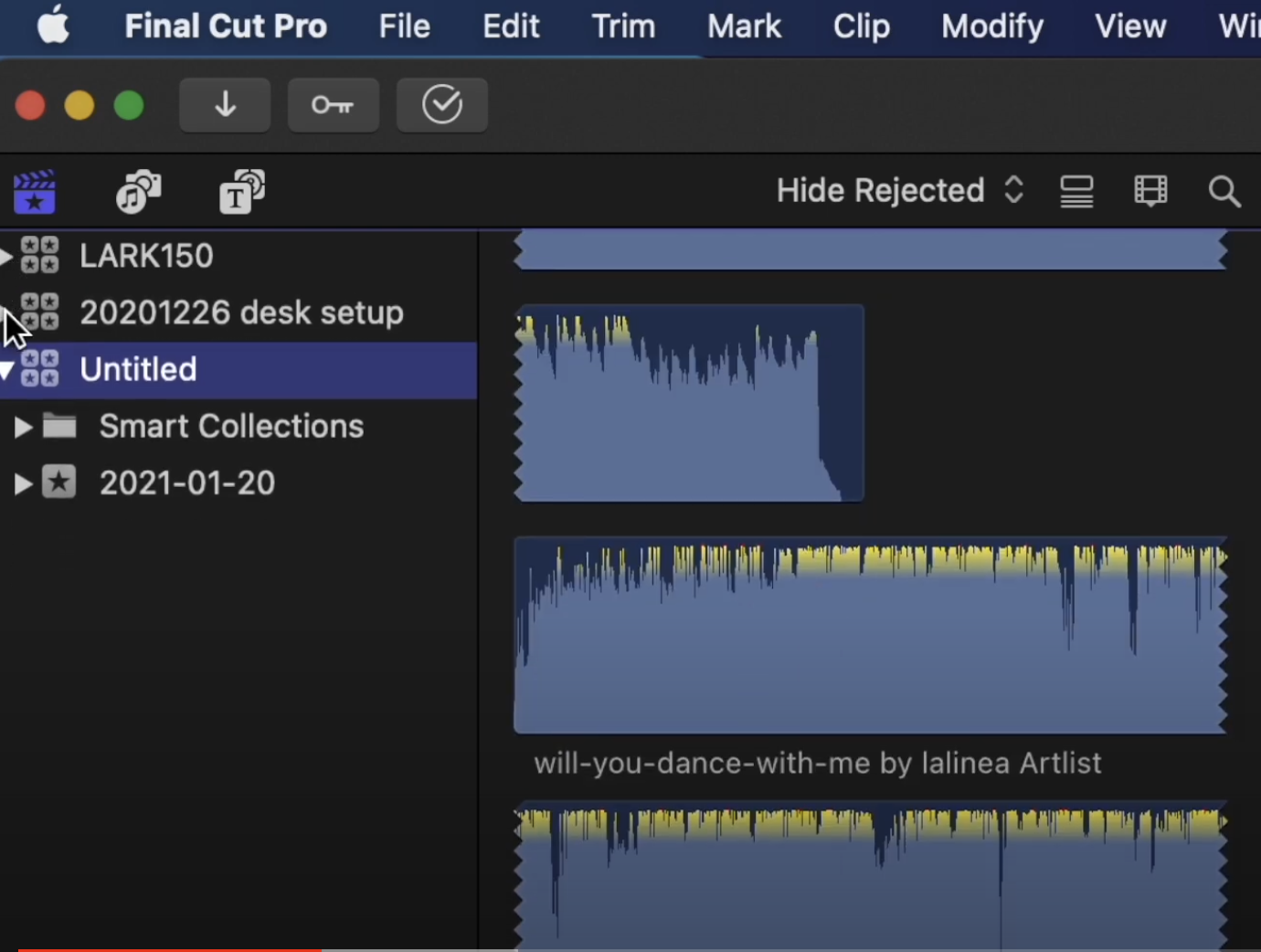 이렇게 현재 작업 중인 라이브러리만 열어두고 작업하는걸 권장합니다. 불필요하게 열려있으면 관리도 힘들고 파이널컷을 오픈할 때도 느려지고 보기에도 안좋으니까요.