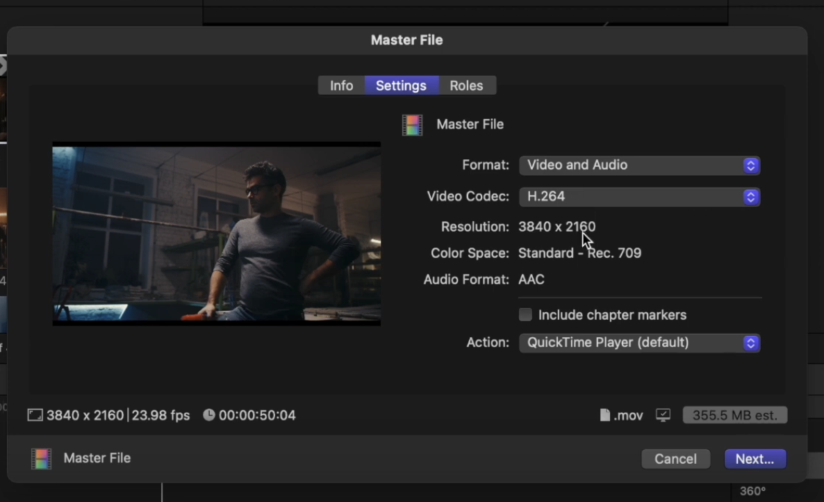 H.264 코덱을 이용하고 화질은 4K로 설정하여 출력합니다. 확장자는 .mov 이며 용량은 355MB 정도입니다.