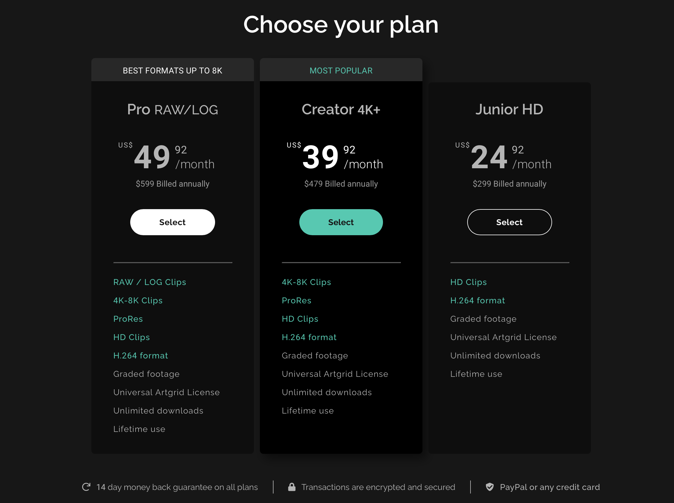 아트그리드의 경우, 가장 저렴한 플랜은 월 25달러 정도입니다. 아트리스트와 마찬가지로 1년 단위로 결제를 해야하며, 아트리스트처럼 한 번 다운로드 한 영상은 결제 기간이 끝나도 계속 사용할 수 있습니다. 영상이라는 콘텐츠는 트랜드에 매우 민감하고 시간이 지날수록 화질이나 스타일이 많이 바뀌기 때문에 지갑에 여유가 있다고 한다면, 꾸준하게 결제를 해서 활용하면 도움이 될 것입니다.