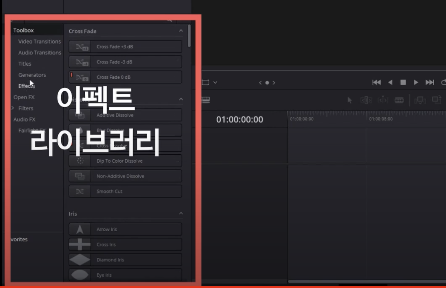미디어 풀 아래쪽에 이펙트 라이브러리가 있고요.