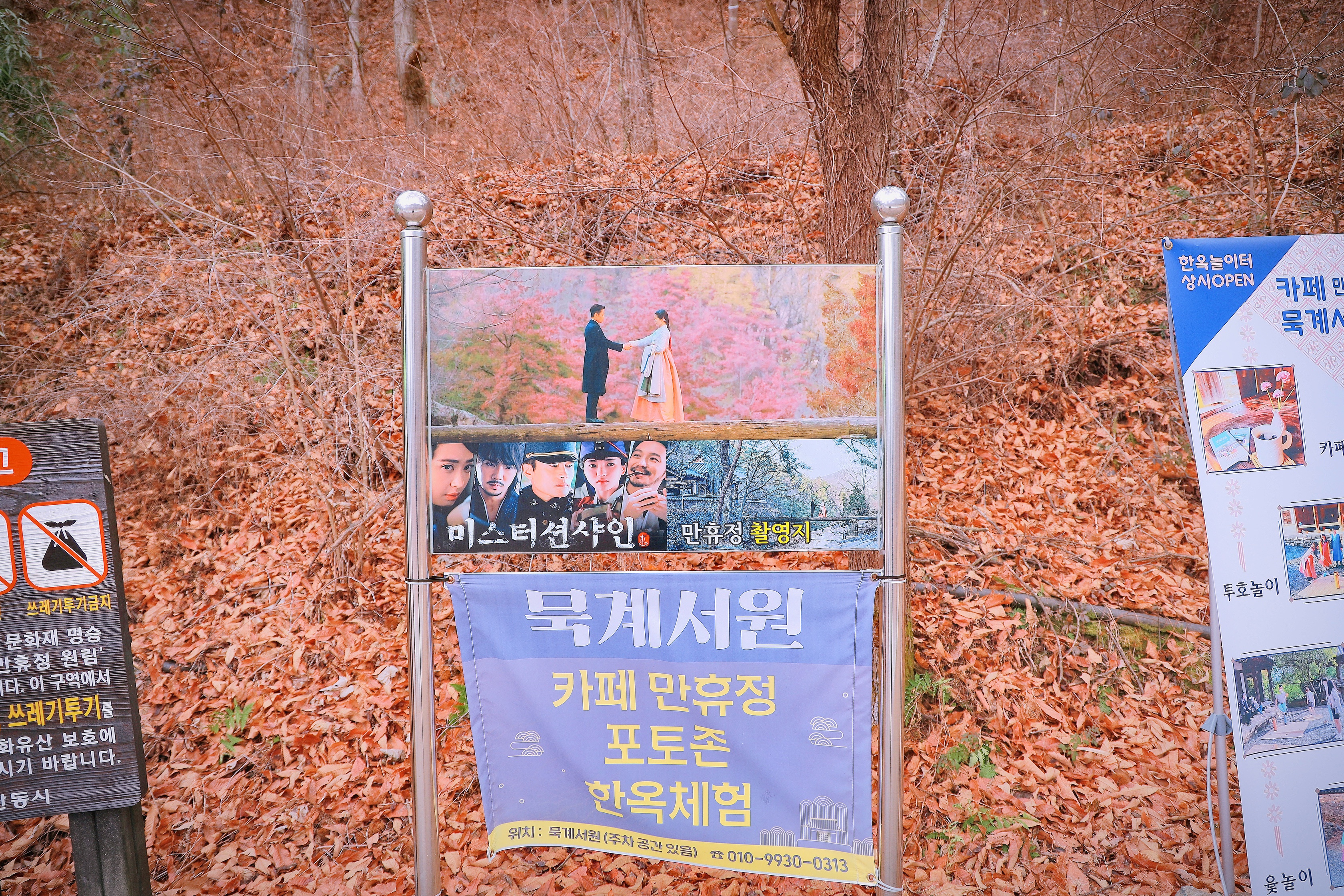 예전에는 찾는이가 드물어서 임시주차장이 없었고 지금 위치로 만휴정 표지판이 있는 곳에 주차를 했었어야했는데 이제는 임시주차장에 주차한 후 만휴정까지 걸어서 올라가야합니다. 거리는 500m 정도 됩니다.