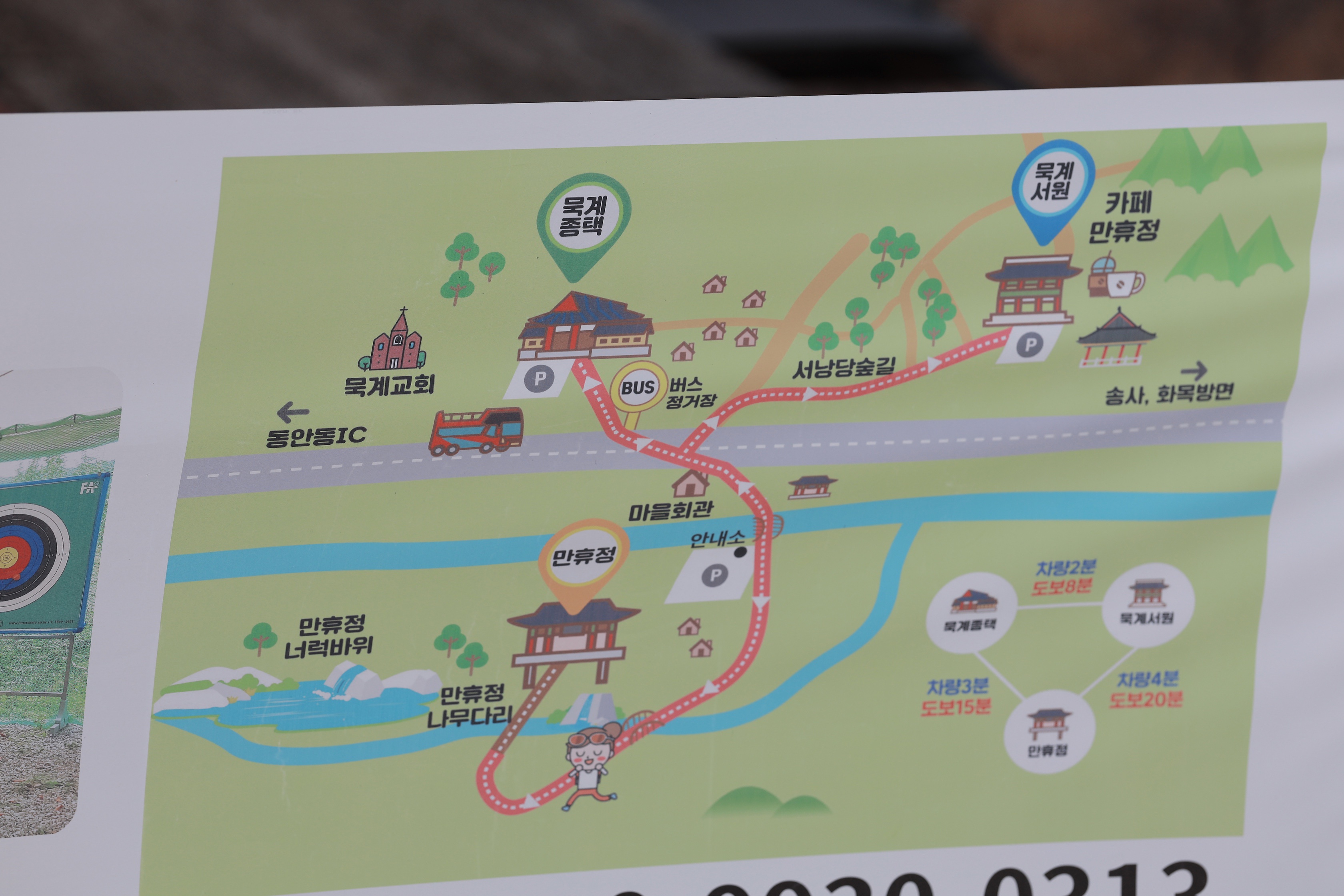 내비게이션에서 만휴정을 검색해서 찾아가면, 다리를 건넌 후 만휴정 임시주차장이라는 표지판이 보입니다. 여기에 주차를 하면 됩니다. 만휴정 임시주차장에 말 그대로 임시로 설치된 이동식 화장실이 있으나 남성용은 모르겠는데, 같이 간 분들에게 들어보니 여성용은 환경이 청결하지 못하다고합니다. 만휴정 자체에는 화장실이 없으므로 다리를 건너기 직전에 있는 묵계1리 회관 쪽에 있는 공중화장실을 이용한 후 가는게 낫습니다.