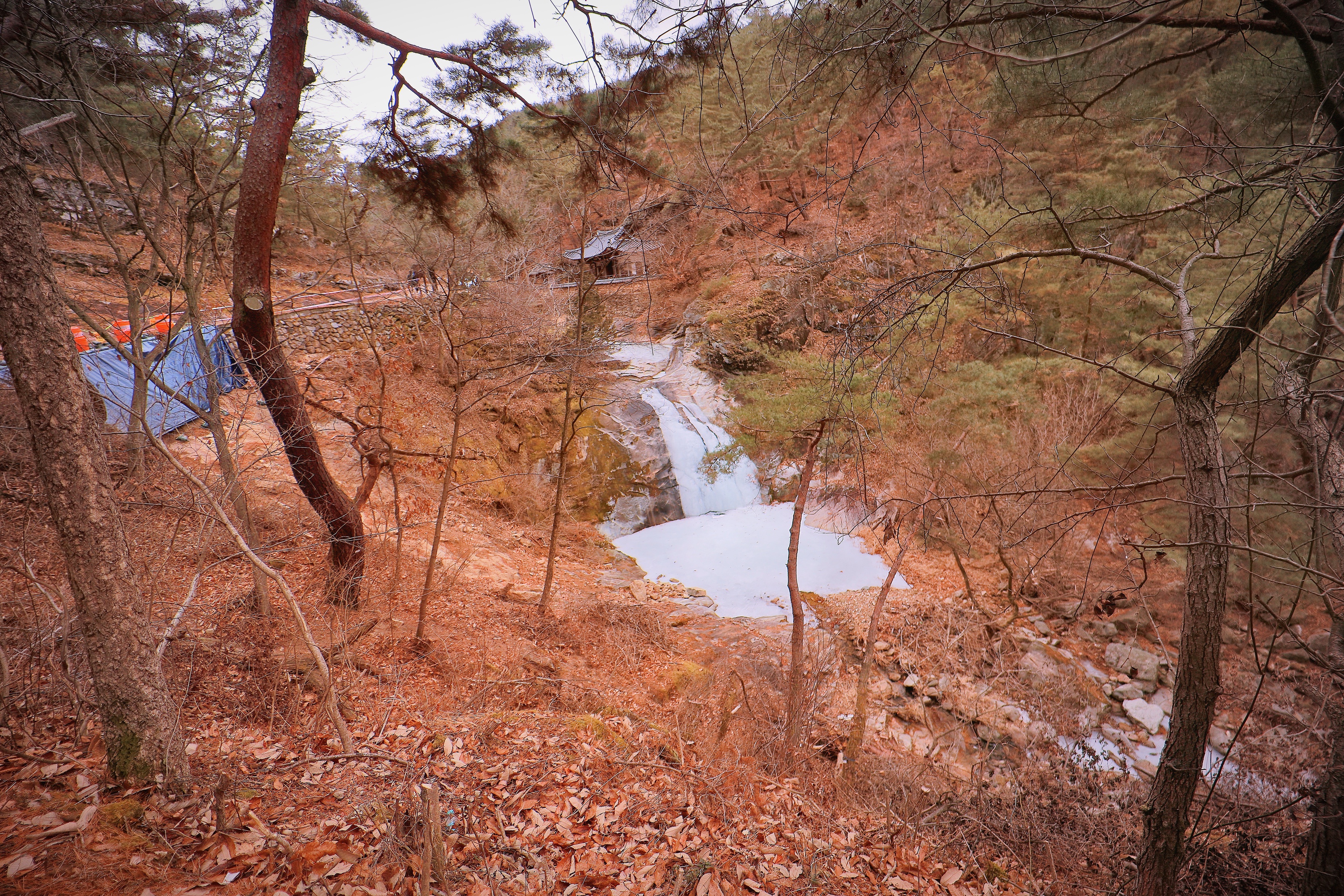 저 멀리 만휴정의 모습이 보이고 만휴정의 자랑거리인 폭포도 보이는 뷰 입니다. 폭포 역시 꽁꽁 얼어서 장관을 연출해주고 있네요. 겨울에 방문한다면, 만휴정 자체를 제외하곤 푸릇푸릇한 느낌은 없습니다. 사실 여름이 사진 찍기에는 제일 좋지만 좀 덥고, 가을이 가장 좋을 것으로 보입니다.