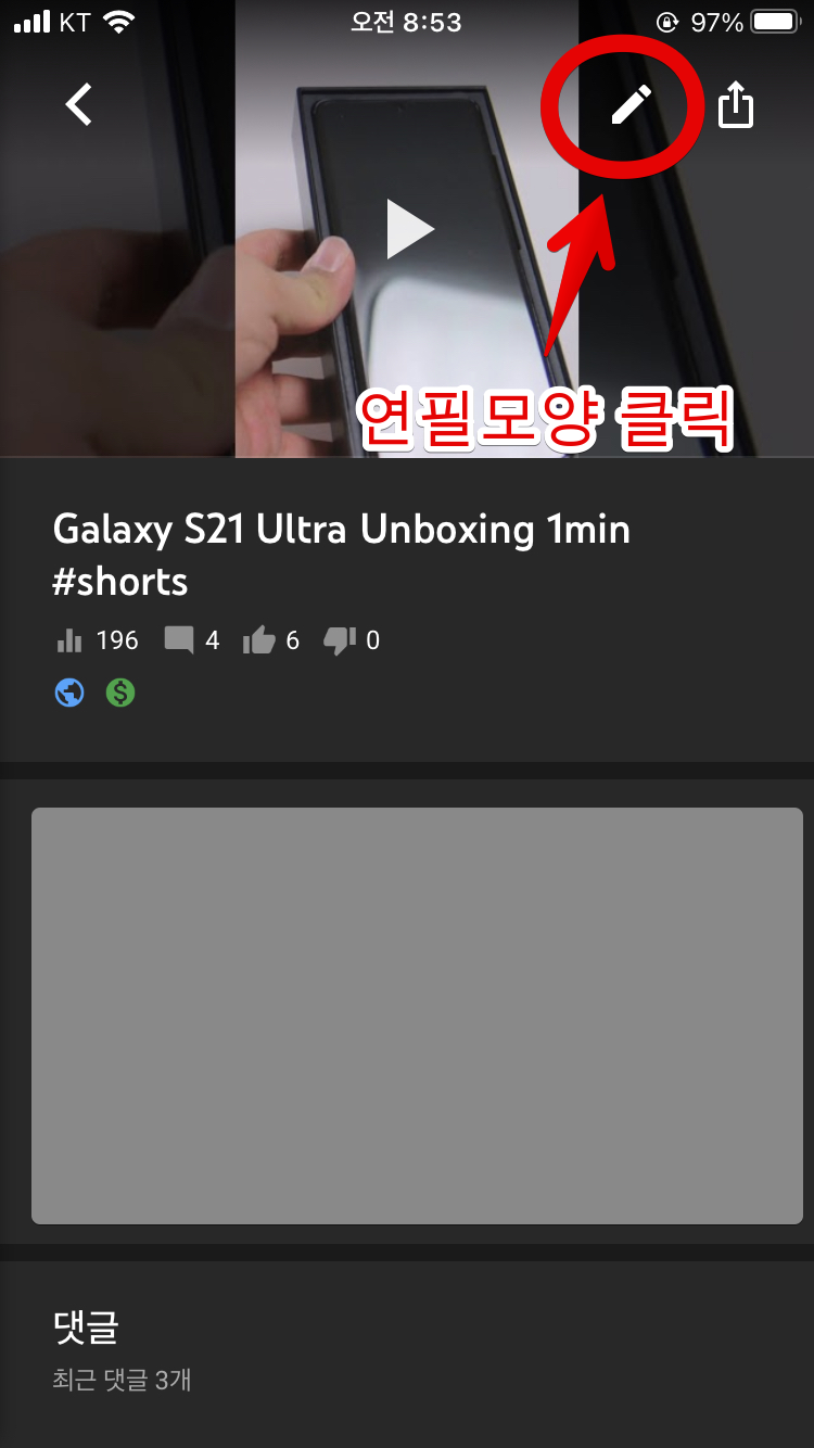 동영상 목록이 나타납니다. 여기에서 삭제하고 싶은 동영상을 클릭하세요. 그러면 동영상의 세부 설정을 바꿀 수 있는 화면이 나오는데 여기에서 상단에 있는 연필 모양을 클릭합니다.