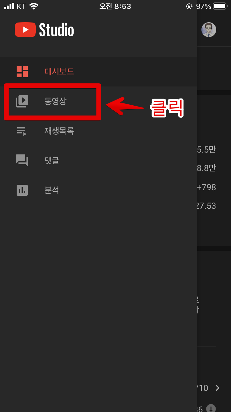 스마트폰에서 유튜브 동영상을 삭제하고 싶다면, 유튜브 스튜디오 앱을 이용하면 됩니다. 유튜브 스튜디오 앱을 다운로드 후 설치하고 로그인 한 뒤 실행합니다. 위와 같은 화면이 나오면 좌측 상단에 있는 석삼자 모양의 버튼을 클릭한 후 동영상 목록을 클릭합니다.