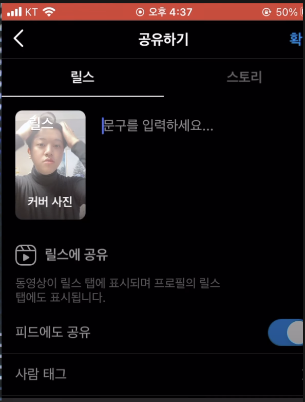 앨범에 저장된 몇 개의 짧은 동영상을 이어붙여 릴스를 만들어봅니다. 인스타그램 릴스에는 따로 제목은 없으며 본문 내용만 기입할 수 있도록 돼 있습니다. 여기에는 해시태그나 사람 태그 등 기존 인스타그램에서 쓸 수 있던 대부분의 기능들을 이용할 수 있습니다. 더불어 피드에도 공유할 수 있으며 인스타그램 릴스 탭에는 무조건 공유됩니다.