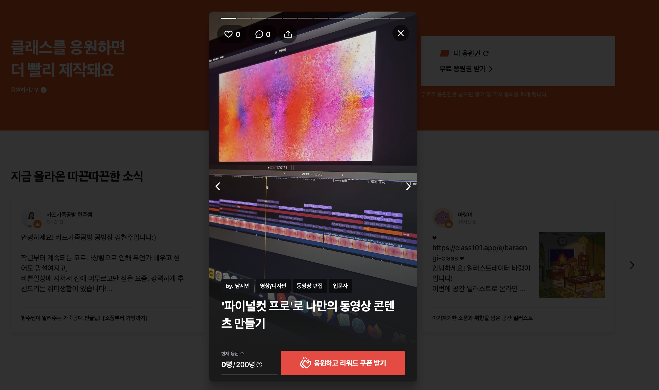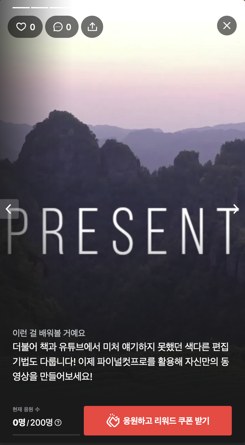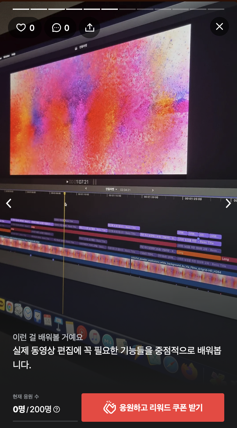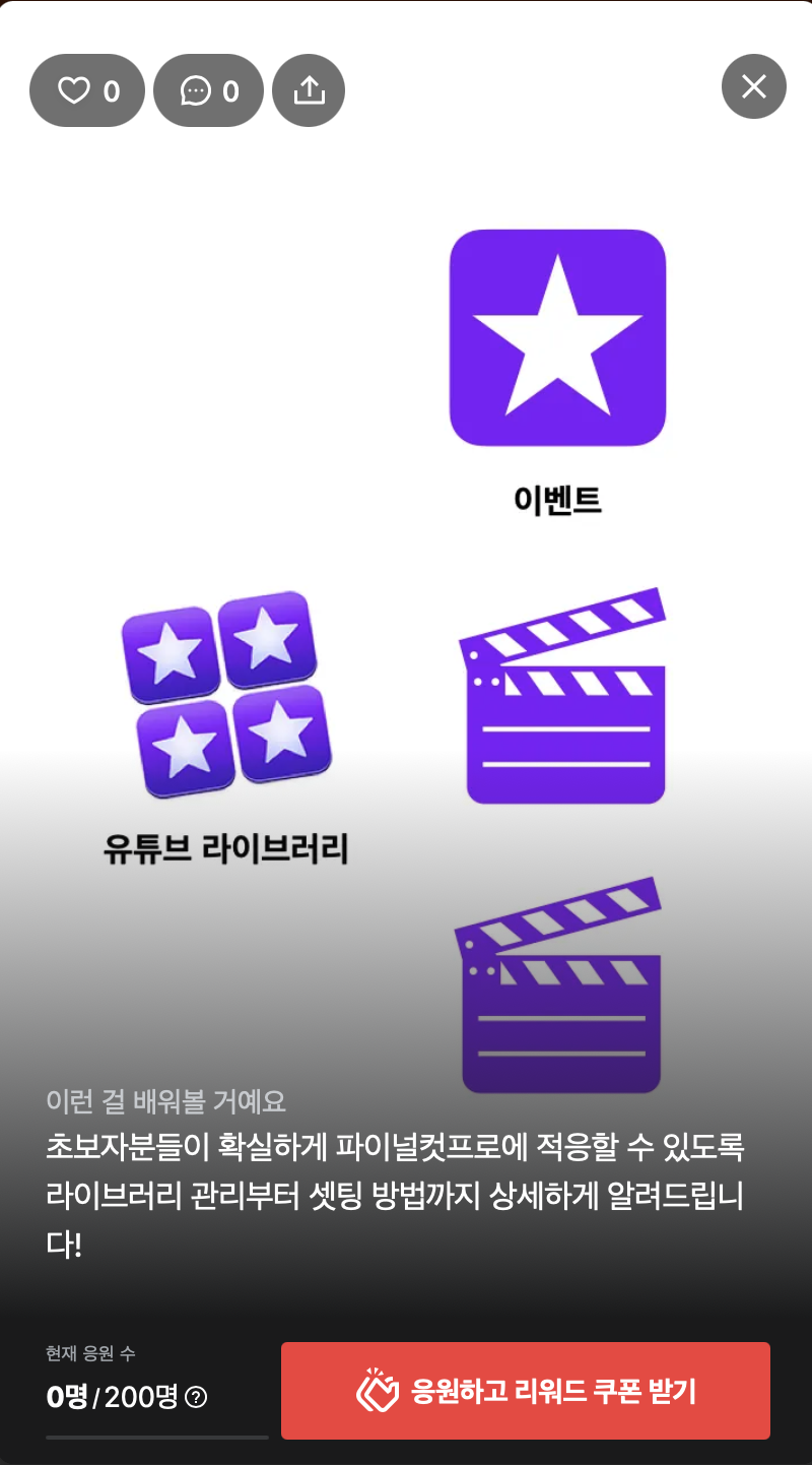 저의 '파이널컷프로'로 나만의 동영상 콘텐츠 만들기 클래스는 아래 링크에서 응원하기 할 수 있습니다. 응원을 해주신분들에겐 특별한 리워드가 함께 제공됩니다. 클래스 오픈이 확정되어야 커리큘럼이 공개됩니다.