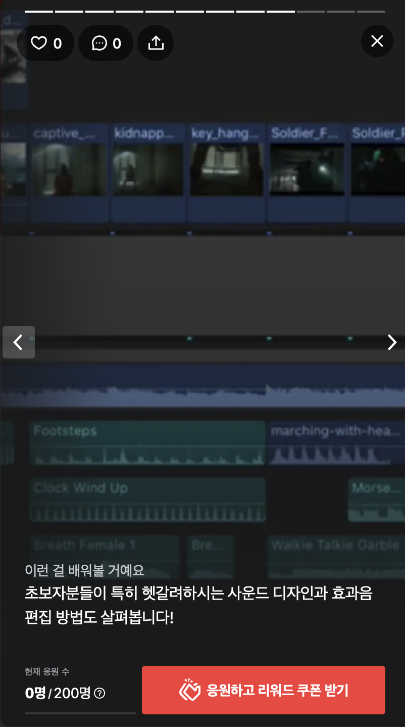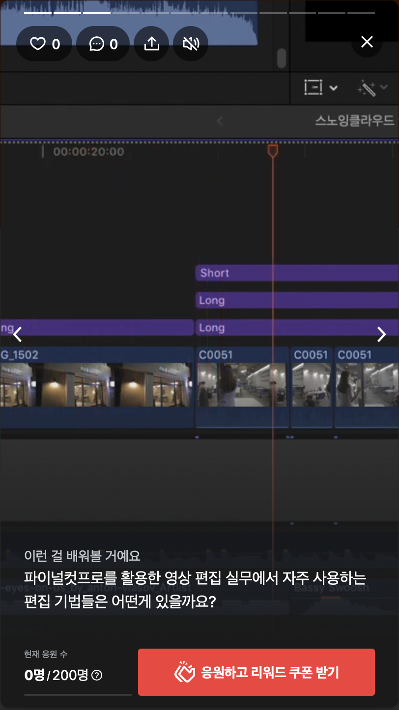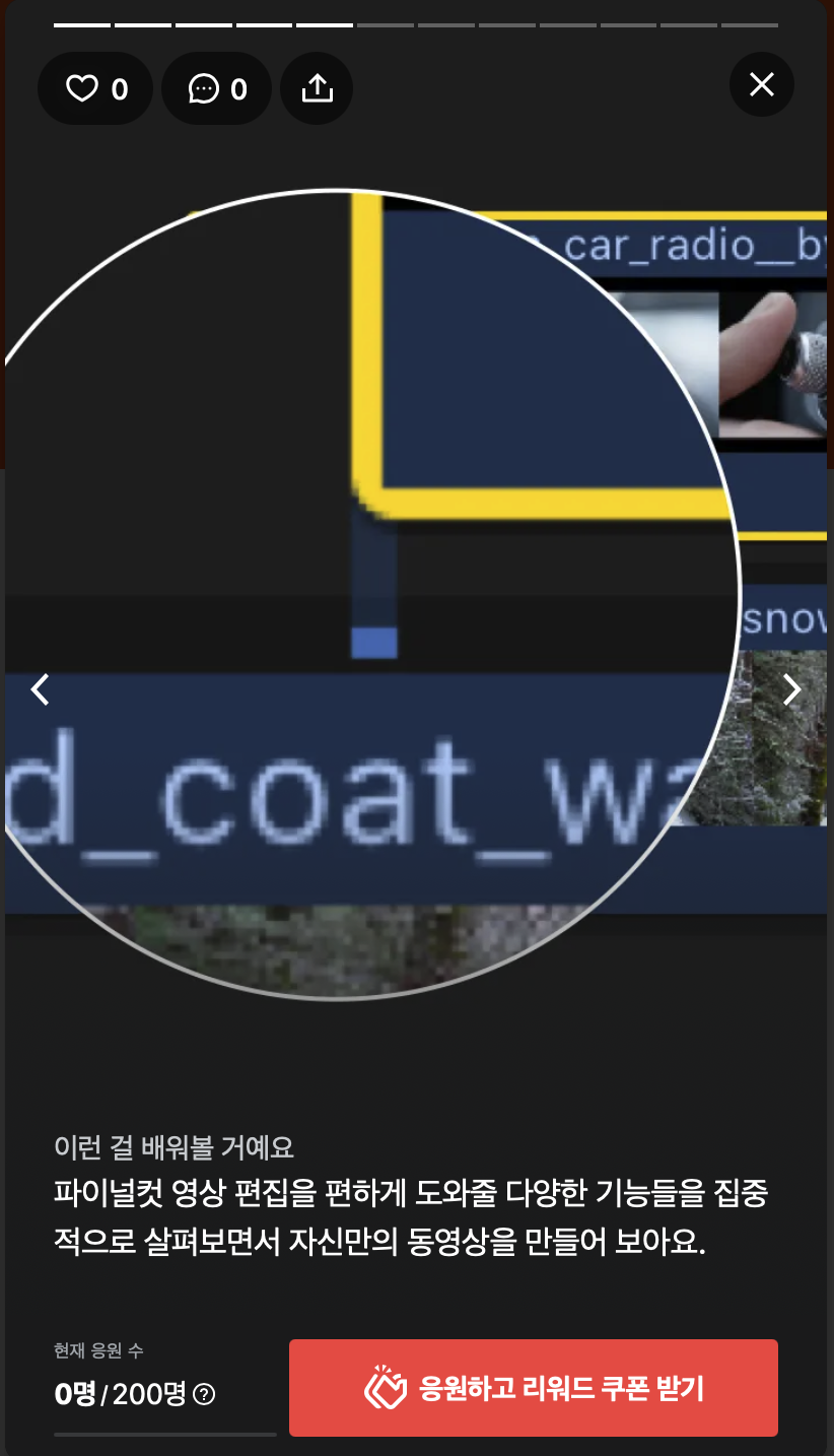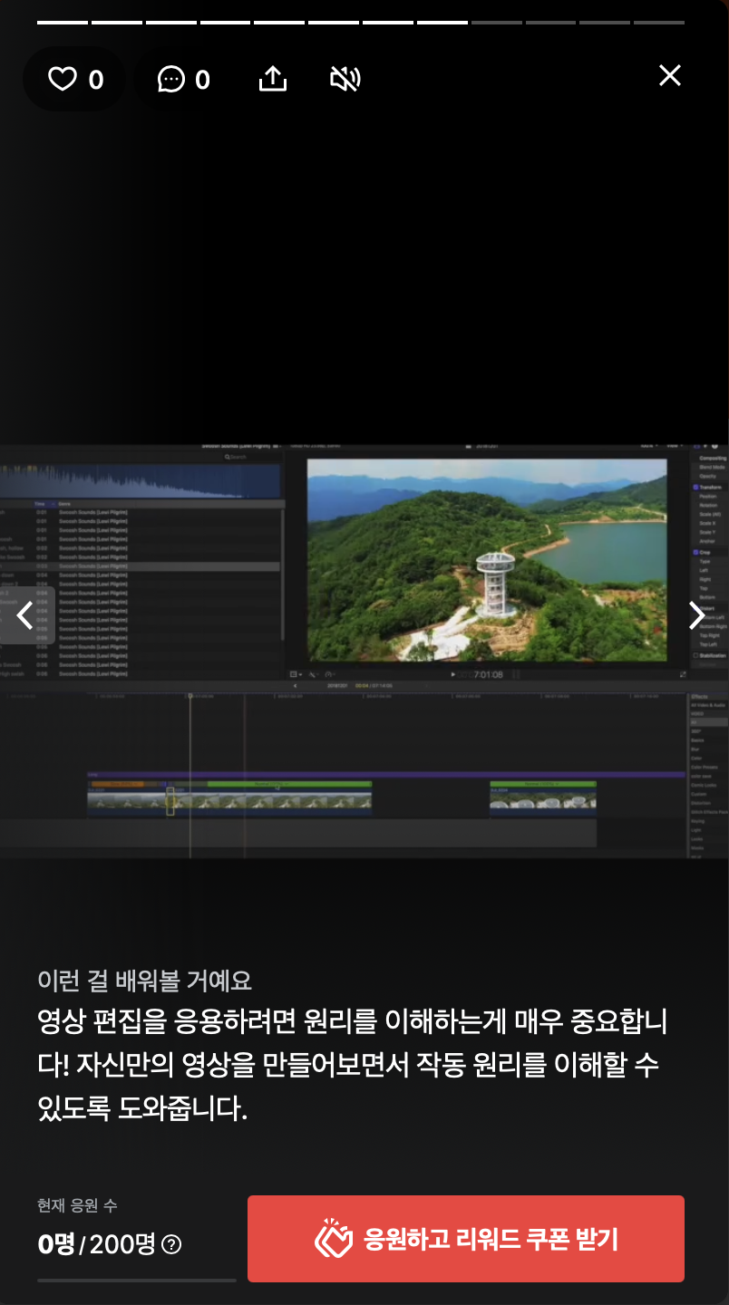 저의 '파이널컷프로'로 나만의 동영상 콘텐츠 만들기 클래스는 아래 링크에서 응원하기 할 수 있습니다. 응원을 해주신분들에겐 특별한 리워드가 함께 제공됩니다. 클래스 오픈이 확정되어야 커리큘럼이 공개됩니다.