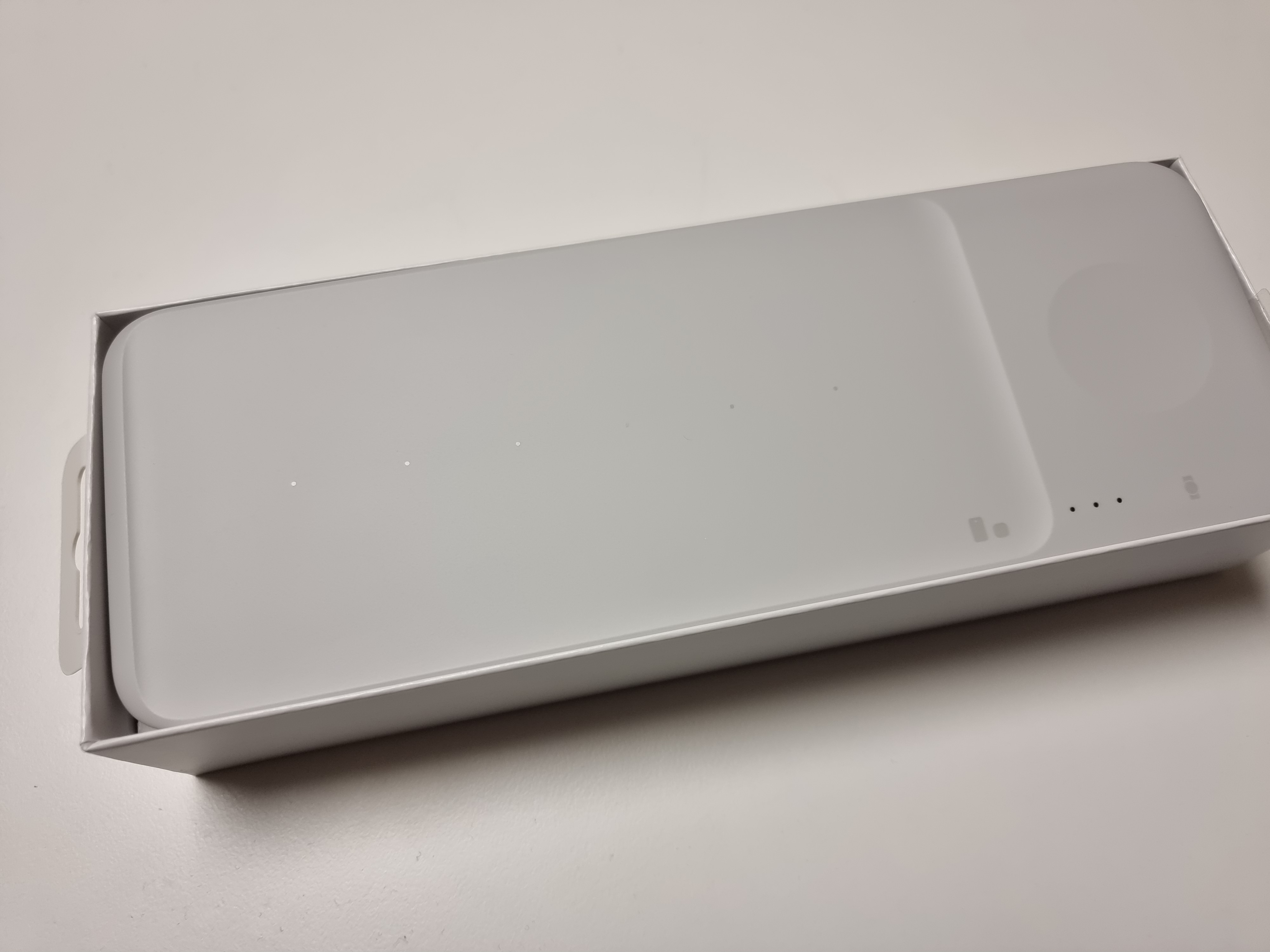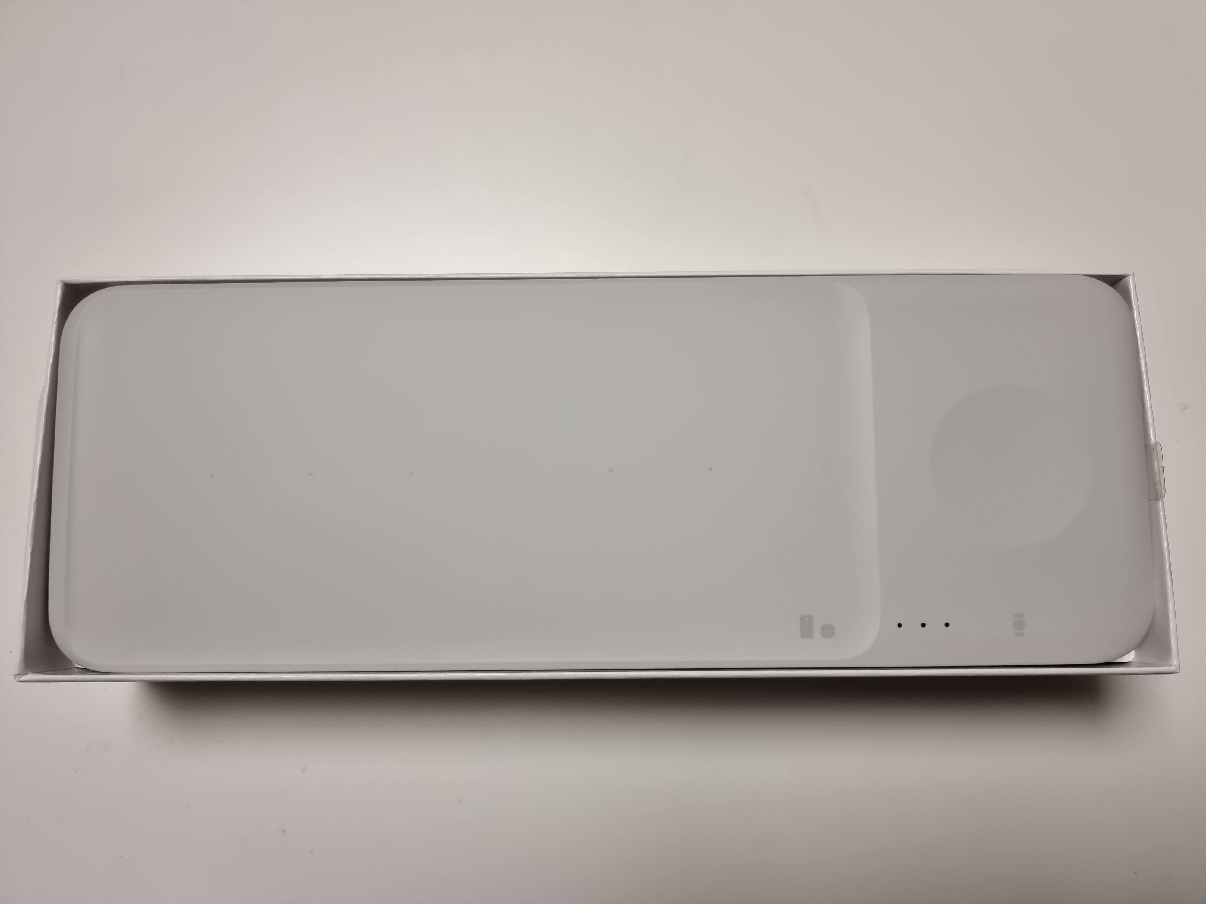 가로로 길쭉한 스타일이다. 처음에는 이렇게 가로로 길쭉해서 조금 못생겨보였는데 실물은 꼭 그렇지는 않다. 너무 길지도 않고 적당한 느낌이다. 왼쪽에 넓은 공간은 스마트폰 또는 무선 이어폰을, 오른쪽에 움푹 패인 곳에는 스마트워치를 충전한다. 스마트워치 쓰시는분들은 별도의 충전기를 제공받지만, 워치에서 주는 무선 충전기는 관리도 힘들고 크기도 작고 여러가지로 불편한점이 많아서 별도의 무선 충전기를 쓰시는분들이 많은걸로 알고있는데, 이렇게 트리오 제품으로 묶여있는걸 사면 보관하기도 좋고 충전하기에도 좋다.