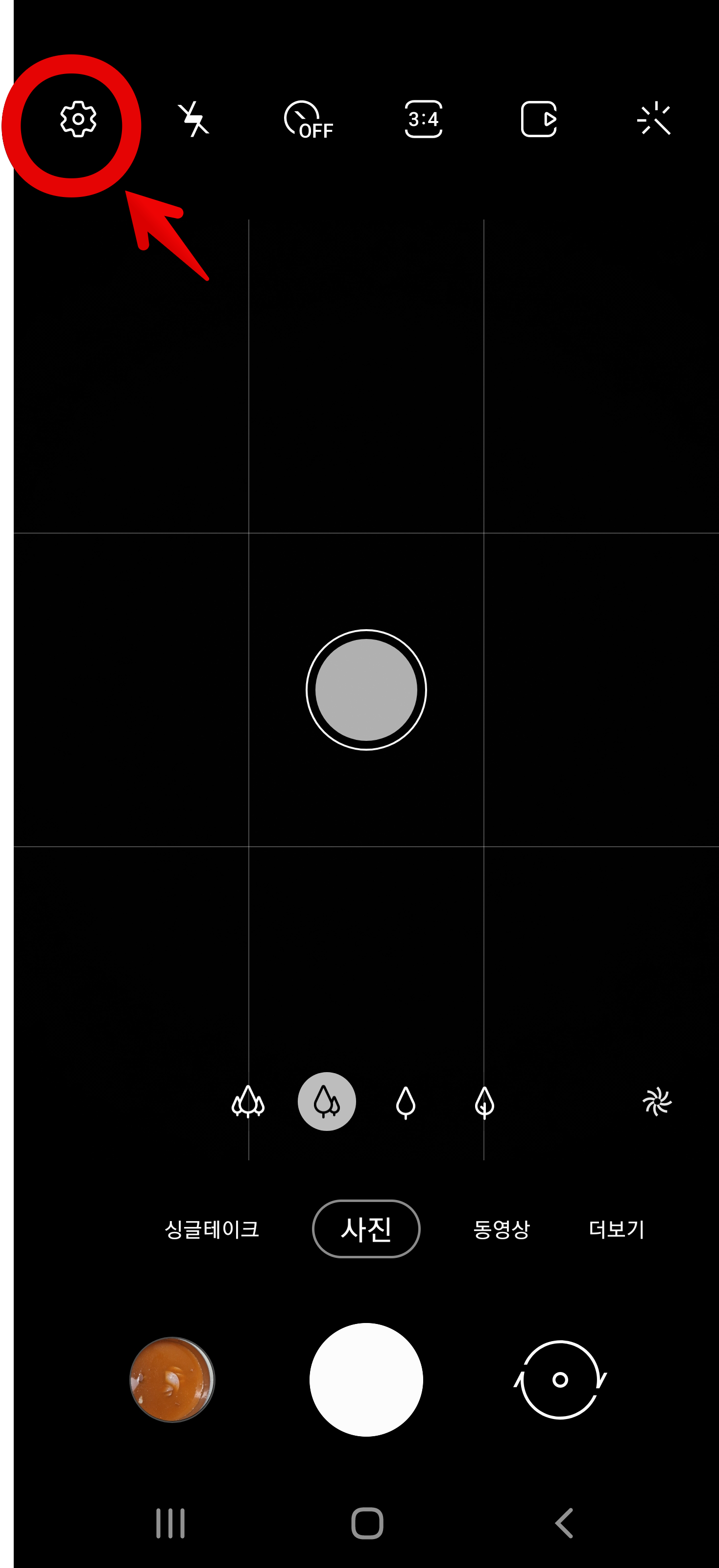카메라 앱을 실행한 후 상단에 있는 톱니바퀴를 눌러 설정으로 들어갑니다. 메뉴 중에 사진 탭에 보면 촬영 버튼 밀기가 있는데 이걸 클릭합니다.