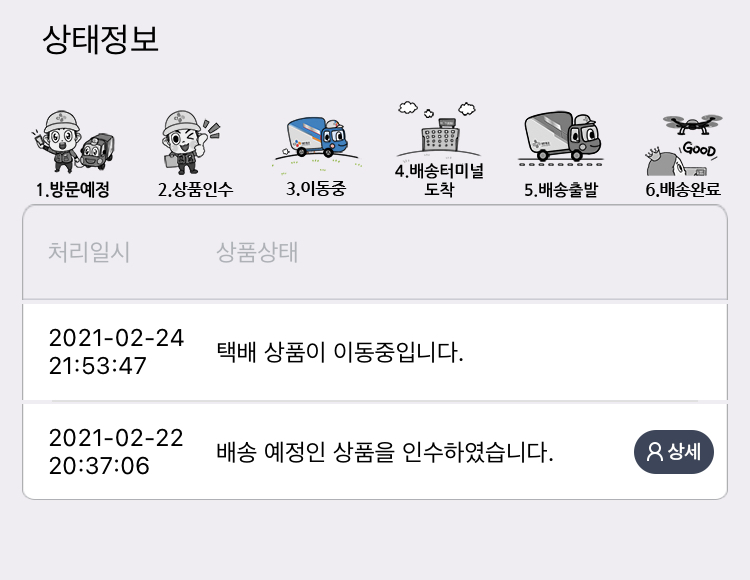 2월 24일은 수요일이고 원래 택배 앱에서는 23일에도 이동중으로 택배 송장은 잡혀있었다.
