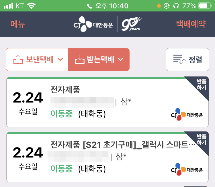 2월 24일은 수요일이고 원래 택배 앱에서는 23일에도 이동중으로 택배 송장은 잡혀있었다.