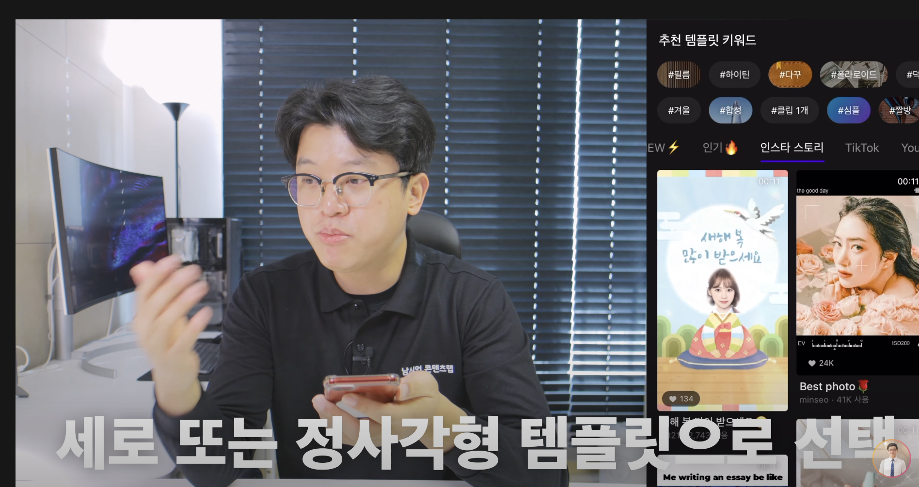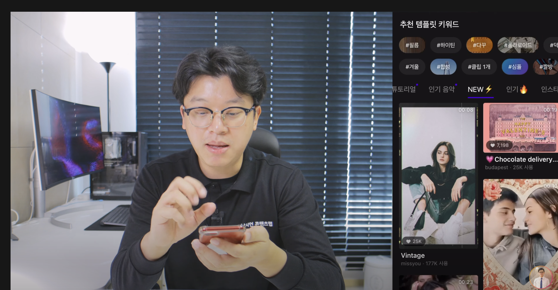 비타 앱 안에 정말 많은 템플릿이 준비되어 있습니다. 틱톡용 뿐만 아니라 유튜브용, 인스타그램 피드용으로 나뉘어져 있습니다. 숏폼 영상은 대체로 세로 사이즈를 사용하기 때문에 틱톡이나 인기 탭에서 고르면 됩니다.