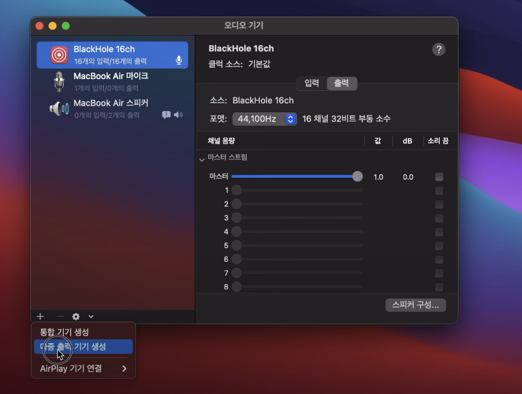 다중 출력 기기로 선택한 후 사용 오디오 기기에 맥북에어 스피커와 블랙홀 16ch를 선택해줍니다.