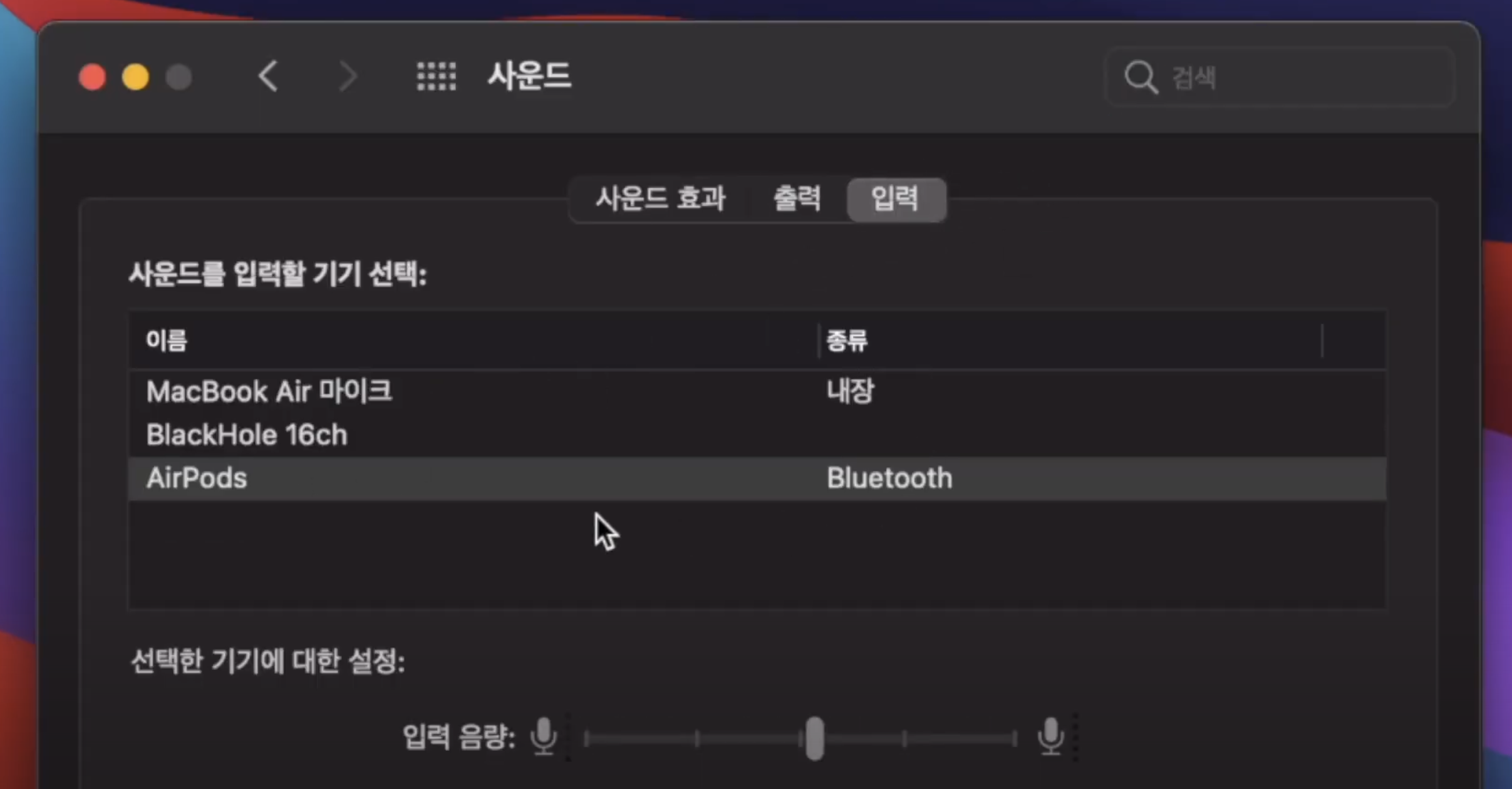 입력과 출력이 에어팟으로 연결되어 있는 모습을 확인합니다.