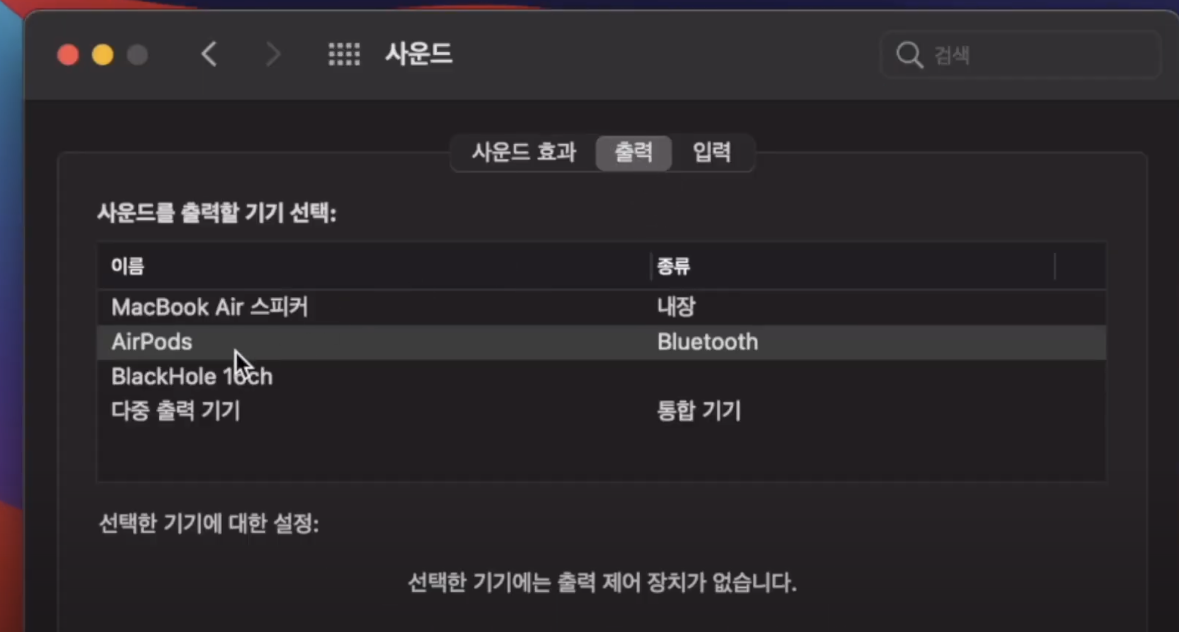 지난번에 만들었던 다중출력기기에서 에어팟이 추가된 모습을 확인합니다. 여기에서 사용에 체크해줍니다.