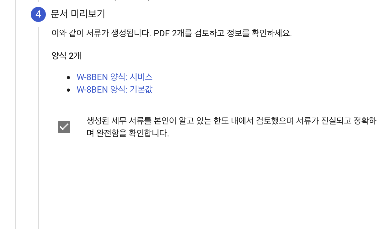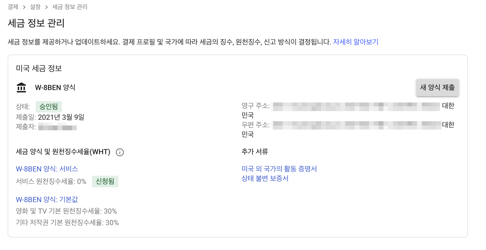 입력이 끝나면 위 그림처럼 세금 정보 관리를 볼 수 있는 화면이 나온다. 서비스에 대한 원천징수세율은 0%이다. (아마도 3천불까지만 그런 것 같다). 영화와 저작권 관련된 원천세율은 30%다.