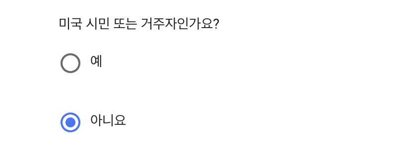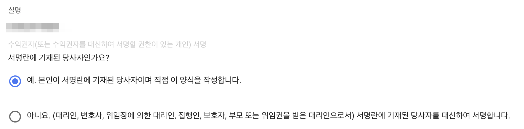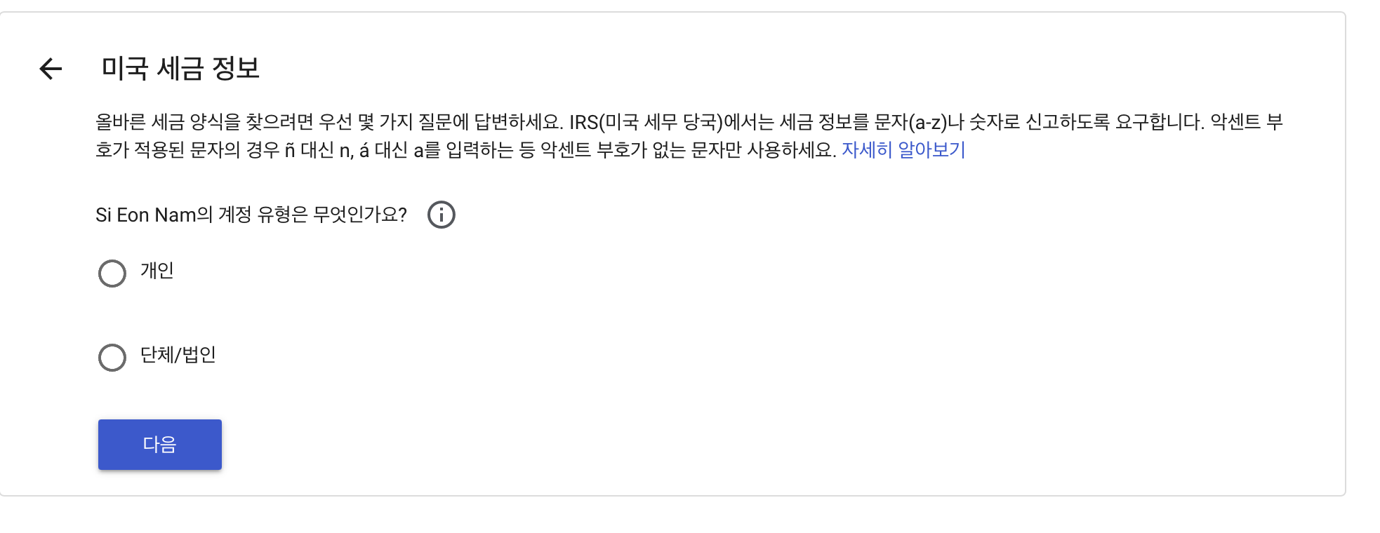미국 시민 또는 거주자와 외국인에 대한 세금이 다르기 때문에 정확하게 입력해야한다. 한국에서 활동하는 크리에이터라면 아니요를 선택한다.