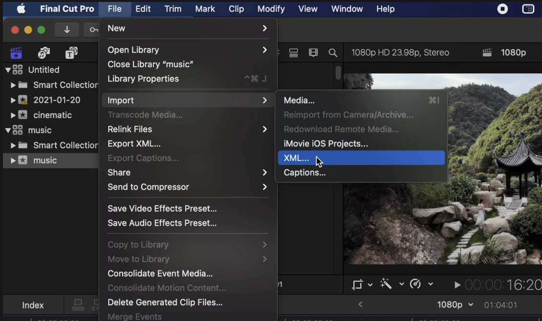 이제 다시 파이널컷으로 와서 File - Import - XML을 클릭합니다.