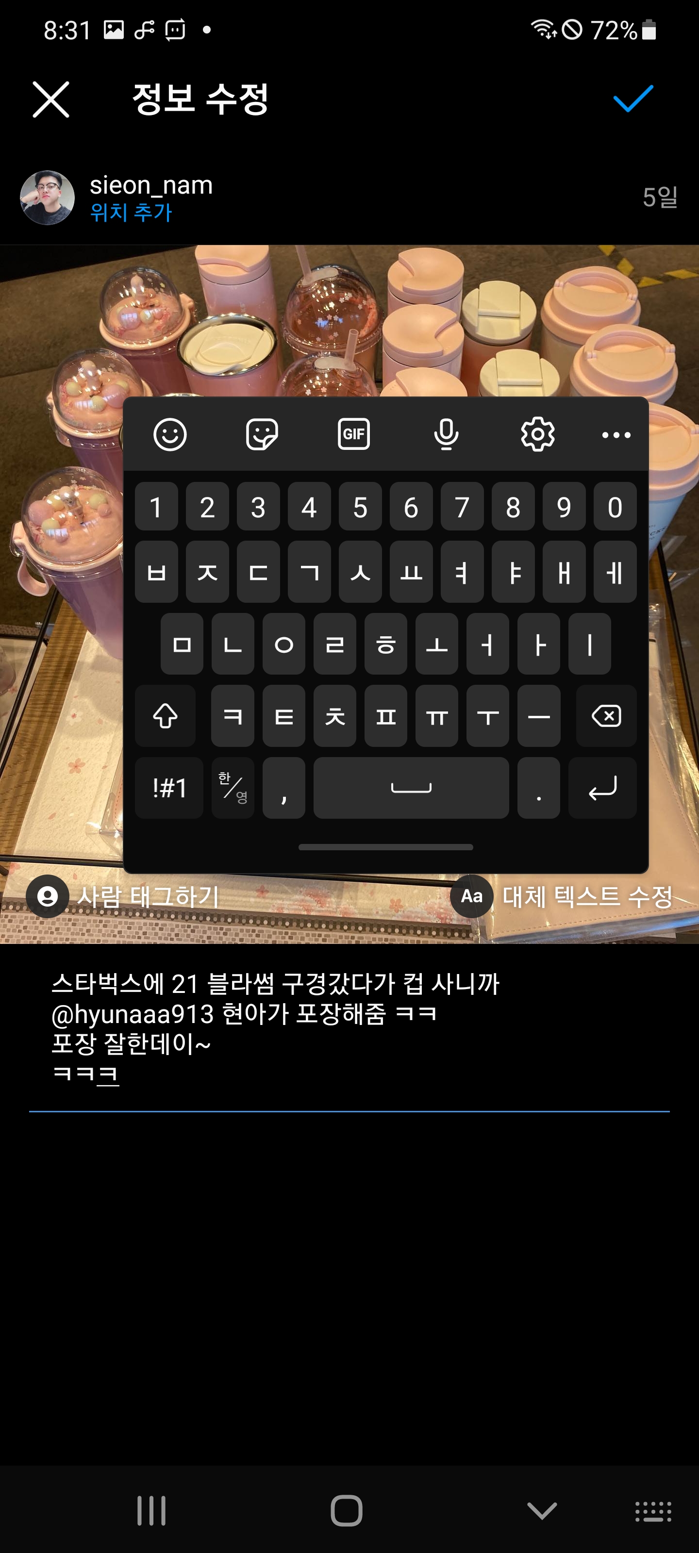 아이폰을 쓸 때에는 이런 경우가 단 한번도 없는데, 갤럭시나 안드로이드폰의 경우 특정 모델에서 인스타그램을 이용할 때, 인스타그램 글 수정을 하게되면 키보드가 안내려가서 글자를 보면서 수정할 수 없는 경우가 있다.