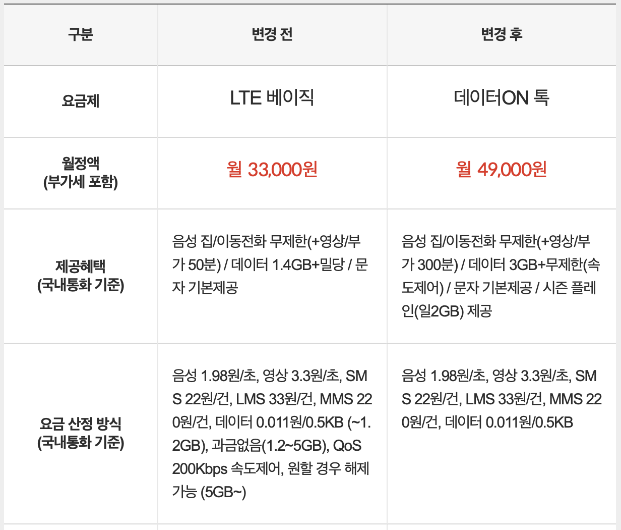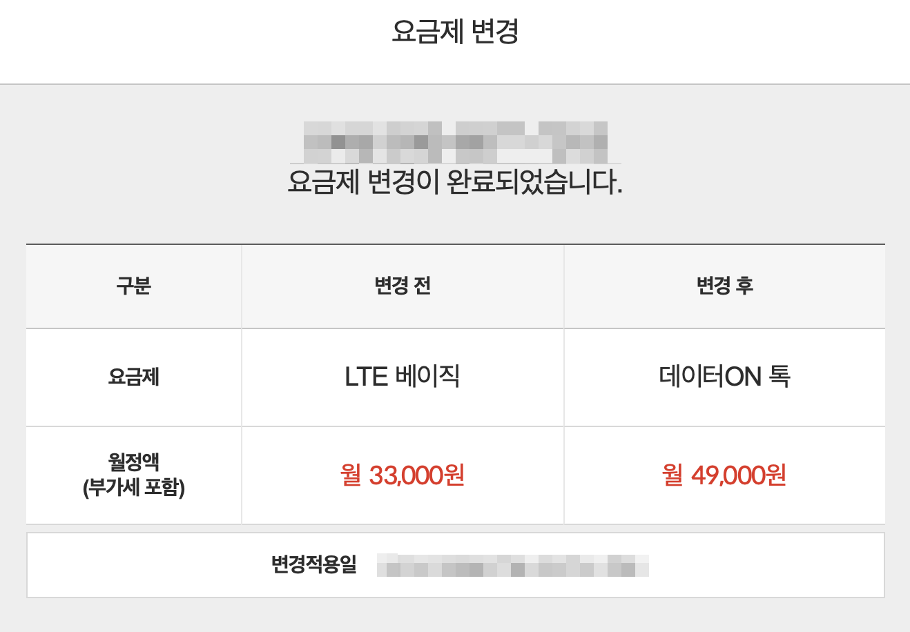 그래서 일단은 요금제를 데이터ON 톡으로 바꾸었다. 원래는 월말에 딱 맞춰서 바꾸는게 최적화일 것 같은데, 평일날 시간도 없고 일을 하다보면 또 깜빡할 것 같아서 시간 있을 때 미리 변경하였다.