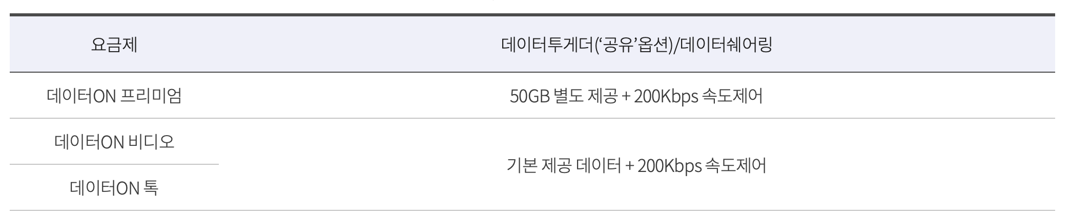 데이터쉐어링의 경우 기본제공 데이터를 모두 소진하면 200Kbps 속도로만 이용할 수 있다.