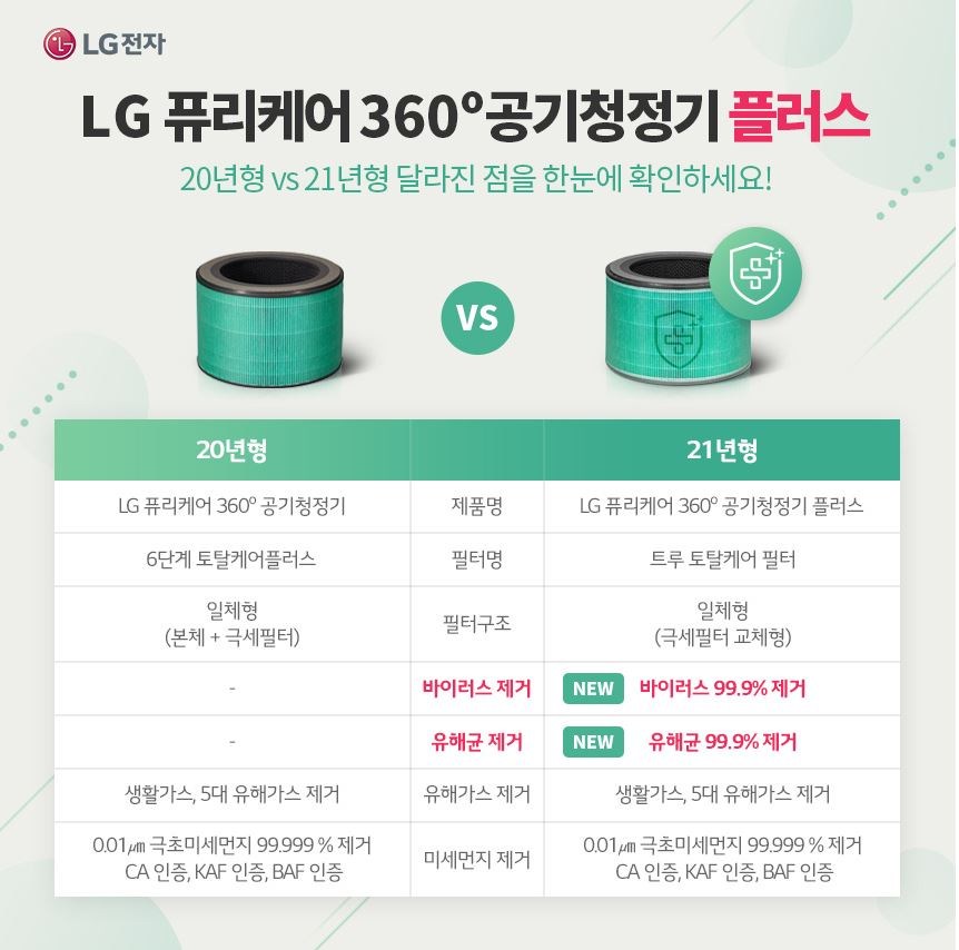 공기청정기 플러스라는 이름이 붙었고 바이러스 제거 기능과 유해균 제거 기능이 필터에 추가되었다. 이왕 사는거 최신 제품으로 구매하고 싶어서 21년식으로 구매했다.