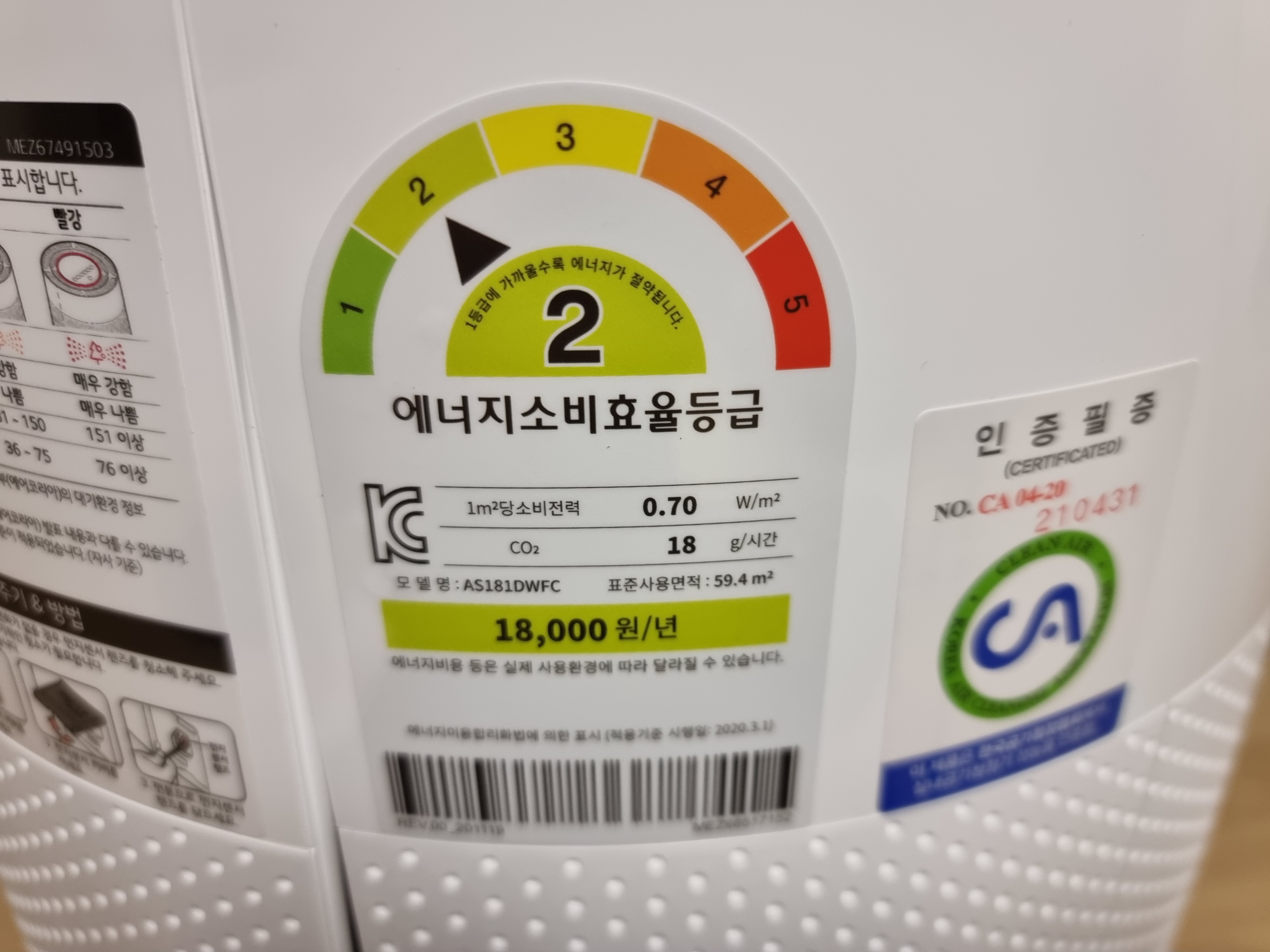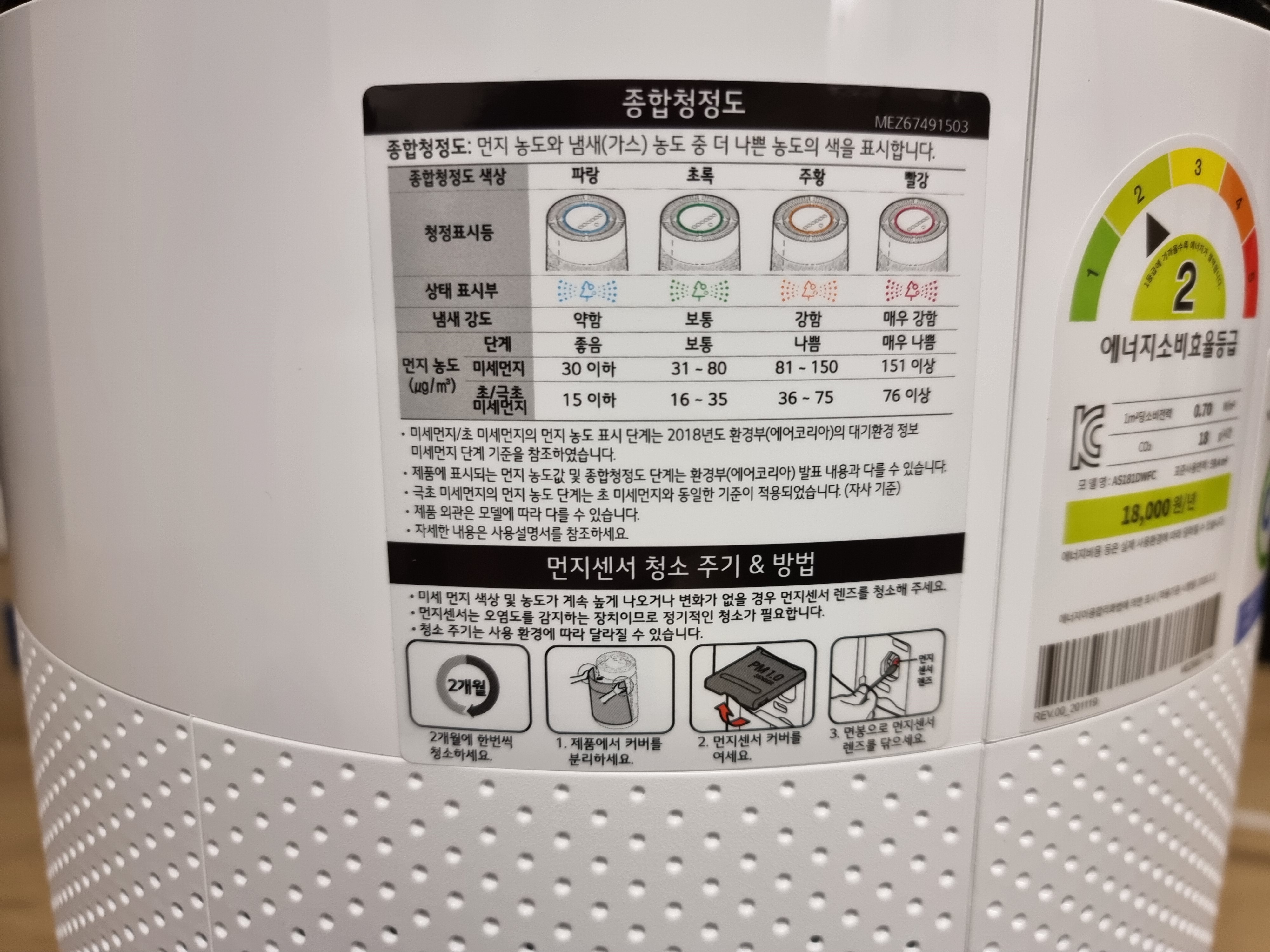 에너지 소비효율등급은 2등급이다. 1등급이 아닌게 조금 아쉽지만, 2등급이라고 하더라도 표시상으로는 1년 기준 18,000원 정도라고 적혀 있으므로 나쁘지 않은 수준으로 보인다. 공기청정기는 보통 계속 커져있거나 굉장히 오래도록 작동되는 특성상 전기세를 절약할 수 있다면 도움이 될 것이다.