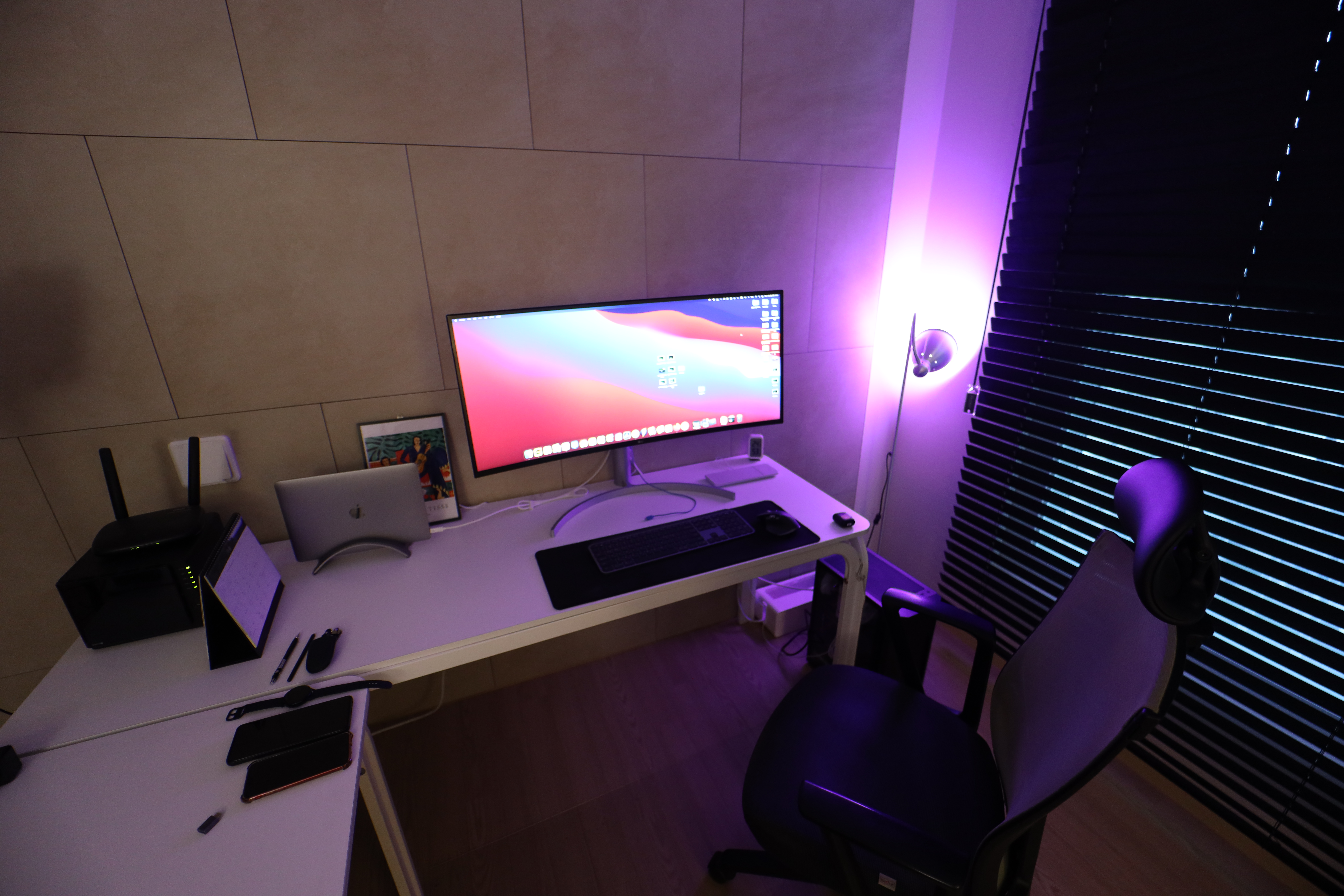 크리에이터 데스크셋업 홈오피스 (M1맥북에어, LG 38인치 커브 모니터)