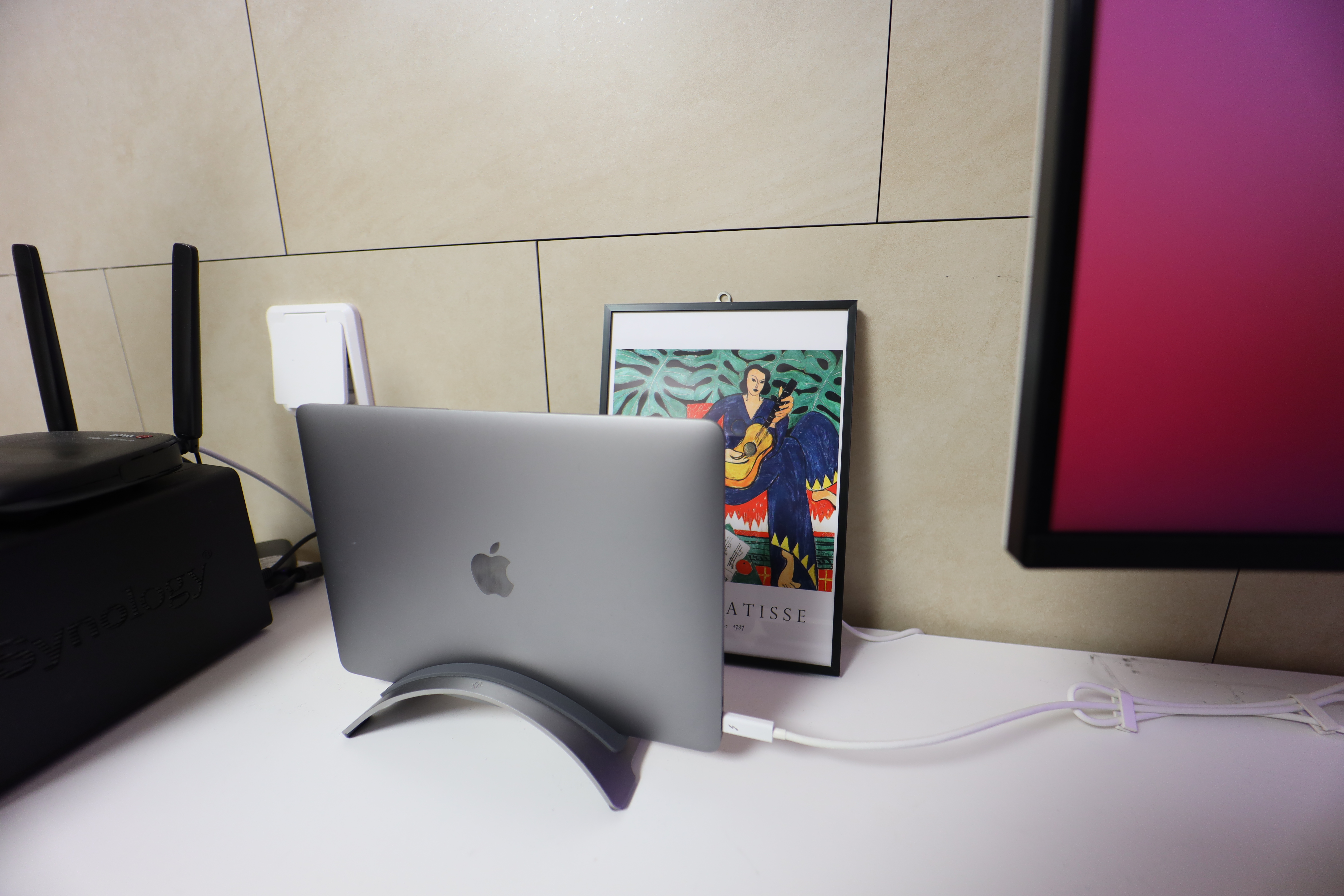왼쪽에는 M1 맥북에어를 두고 그 뒤에 액자를 하나 두었는데 이 액자 뒤에는 무거운 모니터 파워가 얹어져 있다. 덜렁 파워만 있으면 보기가 싫어서 작은 액자를 활용해서 파워를 가려주는 역할로 쓰고 있다.