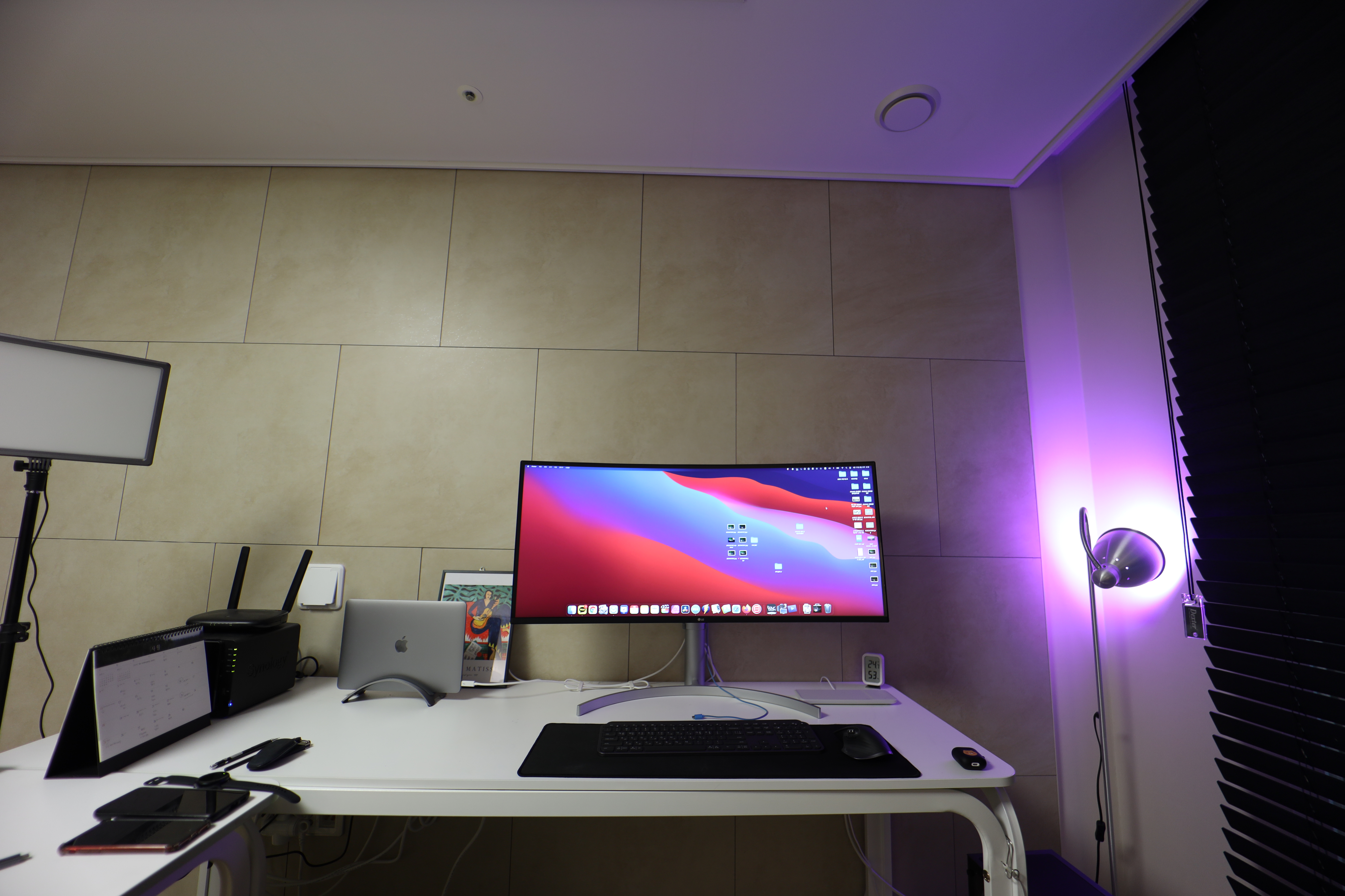 크리에이터 데스크셋업 홈오피스 (M1맥북에어, LG 38인치 커브 모니터)