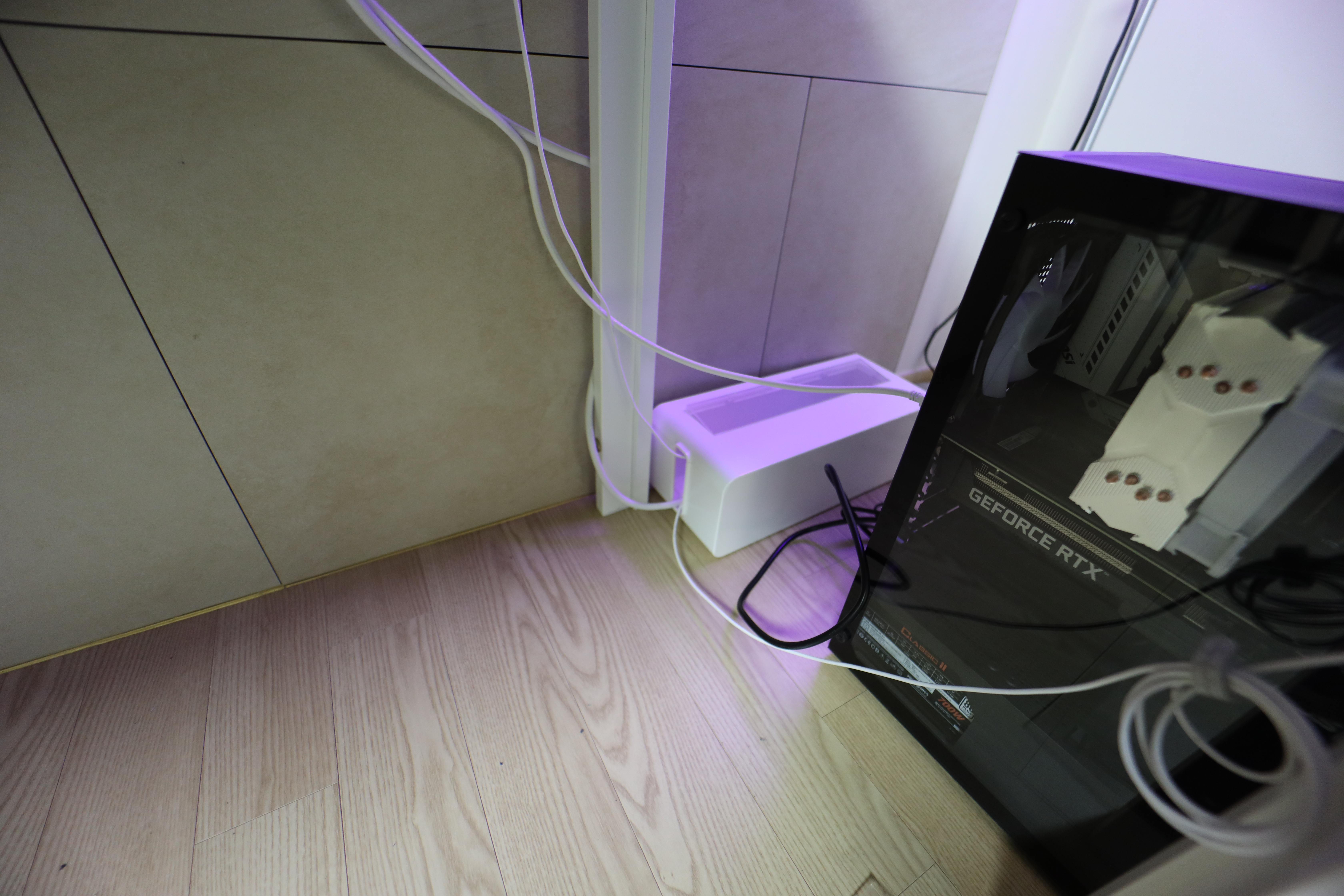 기존에는 전선들과 멀티탭을 책상이나 벽면에 붙여서 사용했었는데, 이제 멀티탭이 2개가 필요해지고 각각 분리할 필요가 있어서 예전에 쓰다가 짱박아둔 멀티탭 보관함을 다시 꺼내었다. 오른쪽 바닥쪽에는 멀티탭 보관함에 윈도우 PC가 연결되고 오른쪽에 있는 전자 기기들이 연결된다.