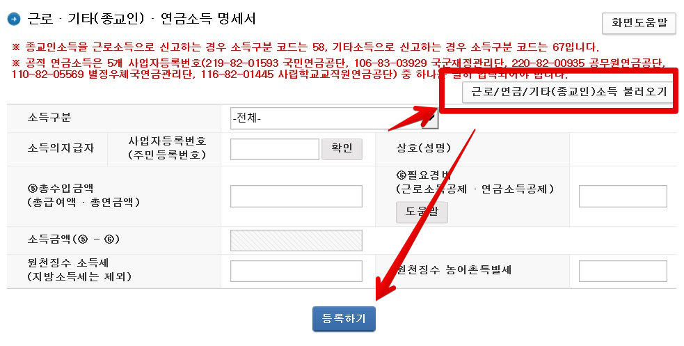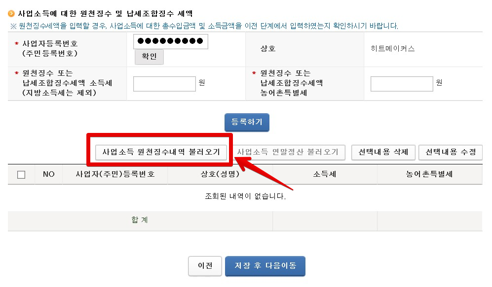 이제 아래쪽에서 사업소득 원천징수 내역을 불러오기 해서 사업을 진행하면서 원천징수된 내역들을 모조리 불러와서 추가해준다.