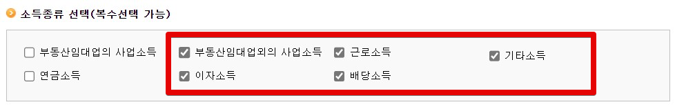 그리고 아래쪽에서 소득종류를 선택한다. 근로소득의 경우, 근로소득이 있더라도 기본적으로 체크가 해제되어 있을 수 있으므로 자신의 소득 유형에 맞는걸 모두 체크해주면 된다.