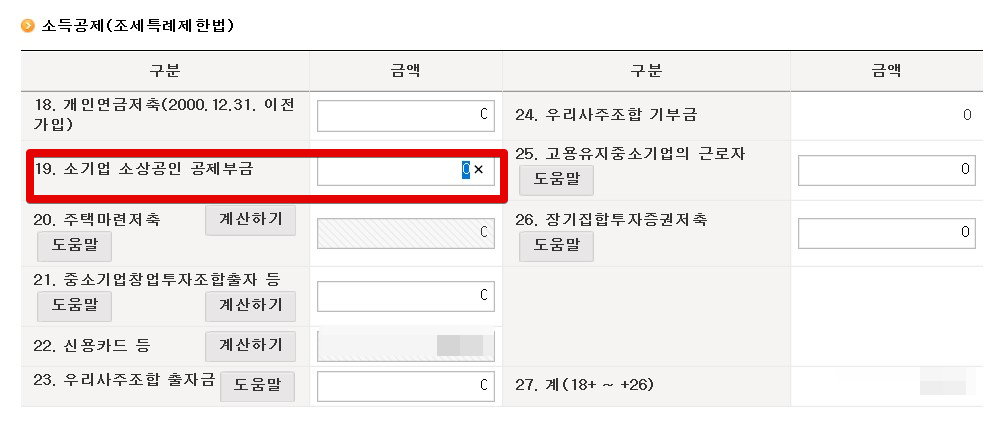 만약 노란우산 공제에 가입하였다면, 납부 금액을 19번 항목인 소기업 소상공인 공제부금 칸에 입력해준다. 그리고 추후 납부내역서를 출력하여 증빙서류로 제출하면 된다. 이렇게 해야만 소득금액을 낮춰서 소득세를 절약할 수 있다.