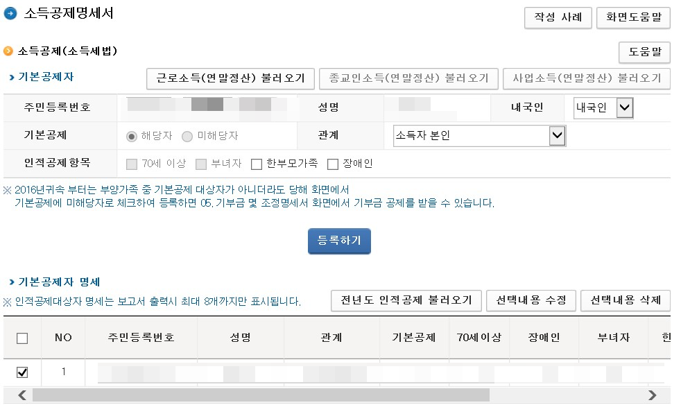 이제 본격적으로 소득공제를 해야한다. 일단 소득공제명세서 화면에서 인적공제를 위해 기본공제자를 입력해준다.