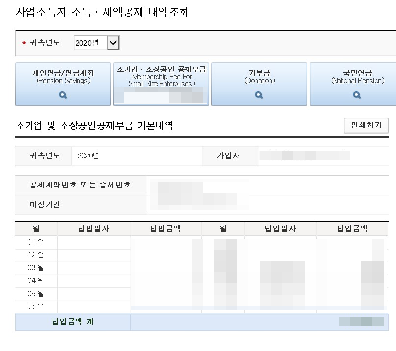 이후 위쪽에 있는 공제부금을 클릭하여 내역을 확인한 후 인쇄한다. 그 다음 스마트폰으로 인쇄된 내용을 사진으로 찍어 종합소득세 증빙서류를 첨부할 때 올려준다.