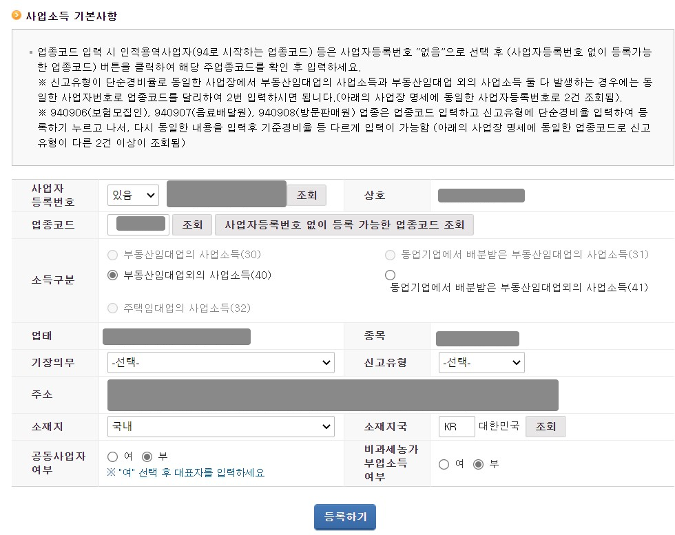 그런 다음 아래쪽에 있는 사업소득 기본사항을 입력해준다.
