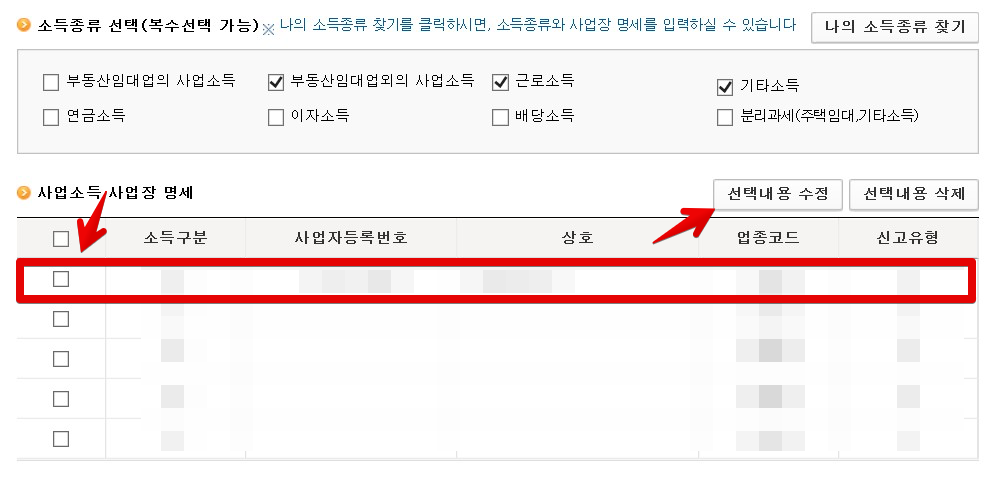 위 그림처럼 여러개의 사업장이 나오거나 하나의 사업장과 여러개의 종목/업태 별로 분리되어 소득이 잡힌 케이스처럼 나올 경우 하나씩 내용을 입력해야한다. 앞쪽에 있는 체크 버튼을 클릭한 후 선택내용 수정 을 클릭해서 업종코드와 신고유형이 올바르게 입력되었는지 확인해야한다.
