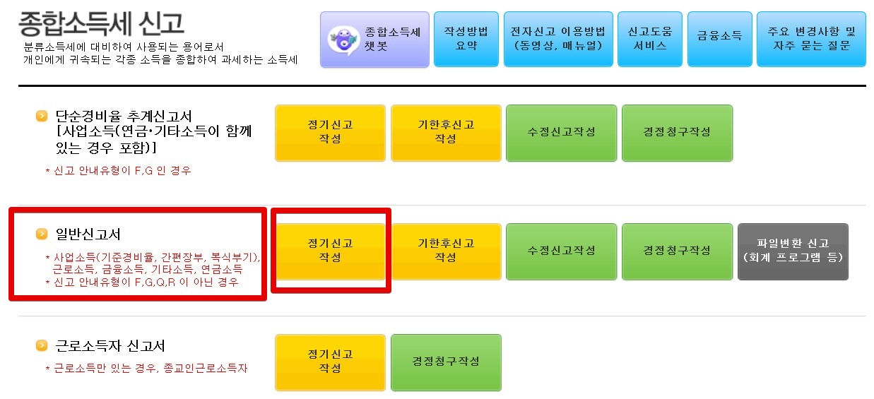 이제 종합소득세 신고 창에서 일반신고서 - 정기신고 작성으로 들어간다.