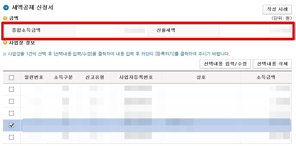 이제 다음 단계로 넘어가서 각 사업장 별로 소득 금액을 하나씩 입력해준다.
