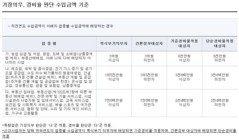 기장의무와 경비율의 판단 및 수입금액 기준은 위 그림과 같다.
