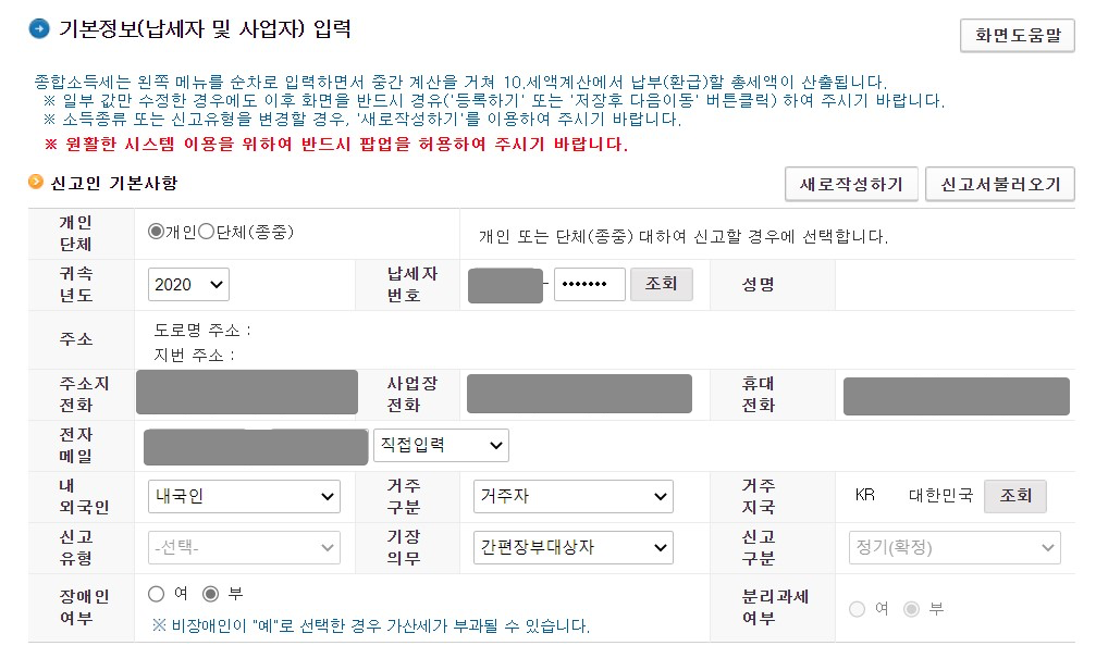 제일 먼저 기본정보를 입력한다. 그러니까 납세자 정보를 입력한다.