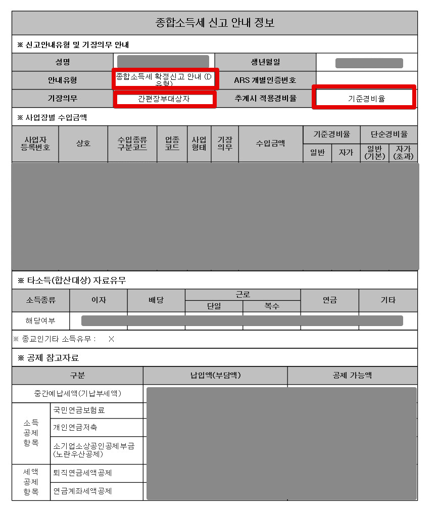 종합소득세 신고 안내 정보 자료가 나오는데 이 기초자료가 종합소득세 신고할 때 매우 유용하게 쓰이므로 미리 출력을 해둔다. 여기에서 안내유형과 기장의무유형, 적용경비율 등을 확인할 수 있다.