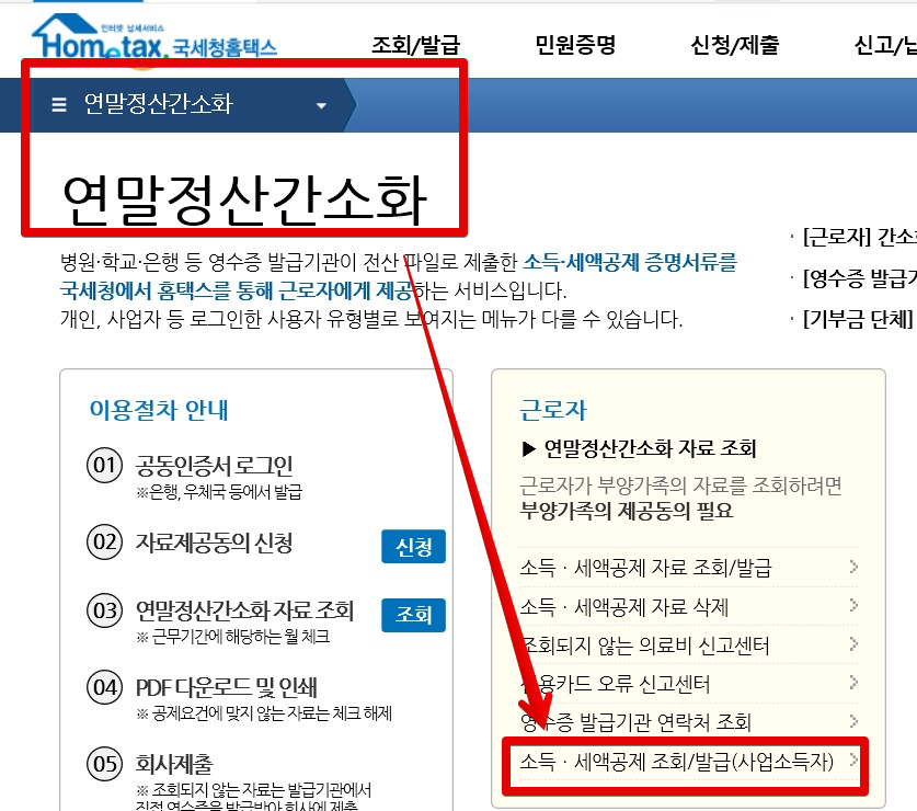 노란우산 공제 증명서를 발급받으려면 종합소득세 코너가 아니라 연말정산간소화 코너로 가야한다. 여기에서 소득 세액공제 조회/볼급(사업소득자)를 클릭한다.