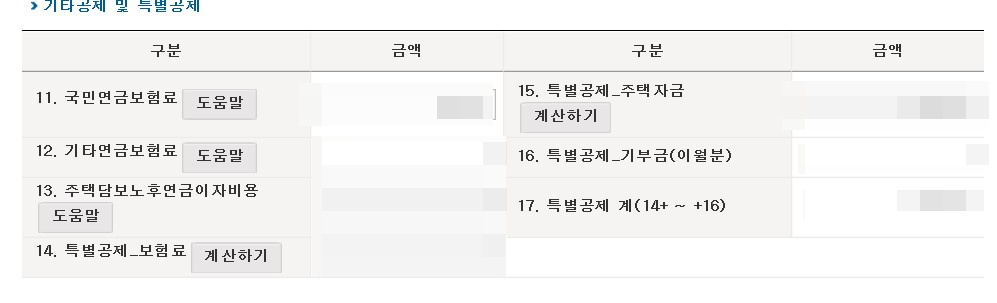 계산하기 버튼을 눌러서 해당하는게 있는지 체크한 후 넘어간다. 참고로 근로자가 아닐 경우, 주택자금이나 신용카드 공제 등은 받지 못한다.