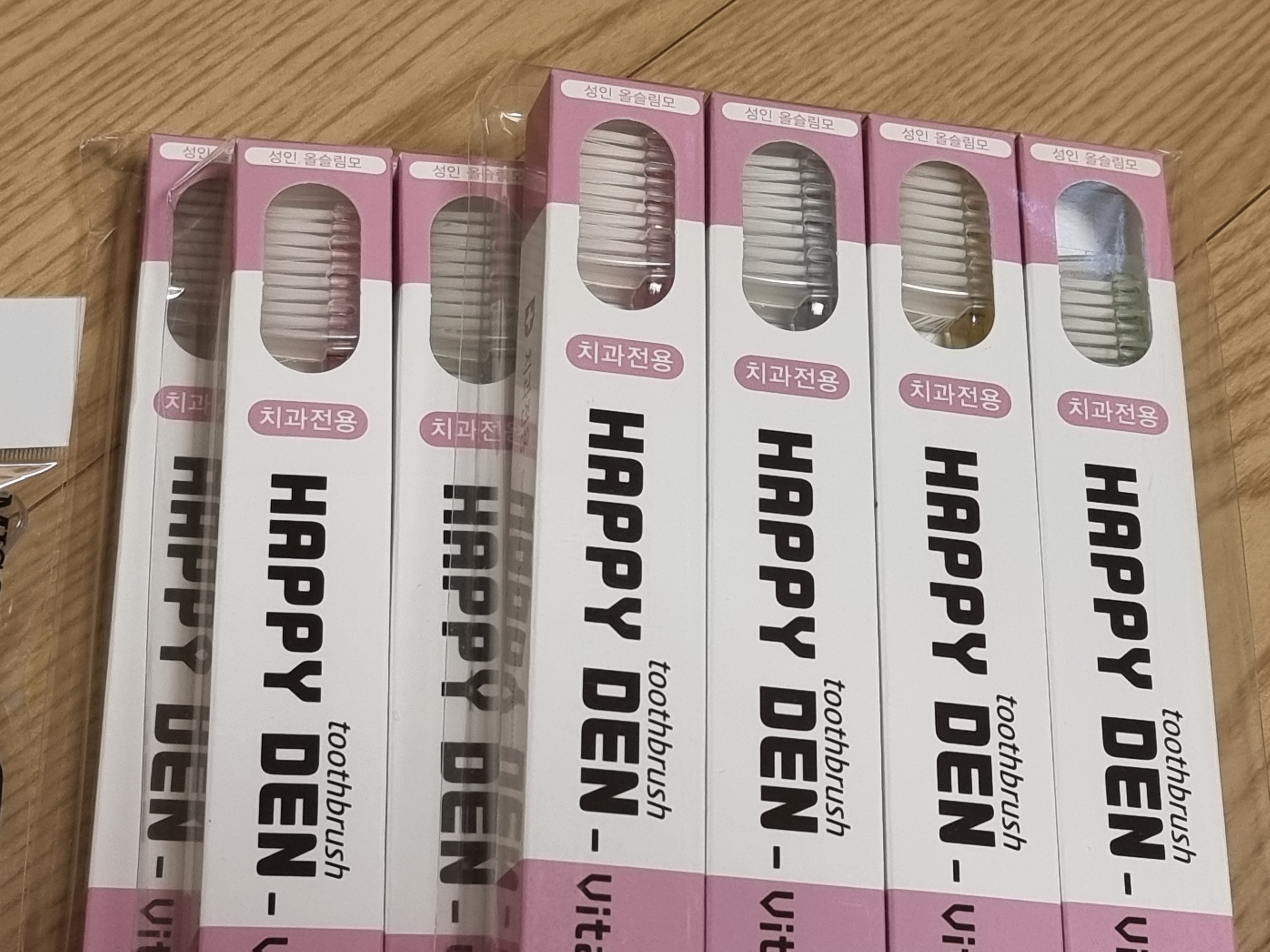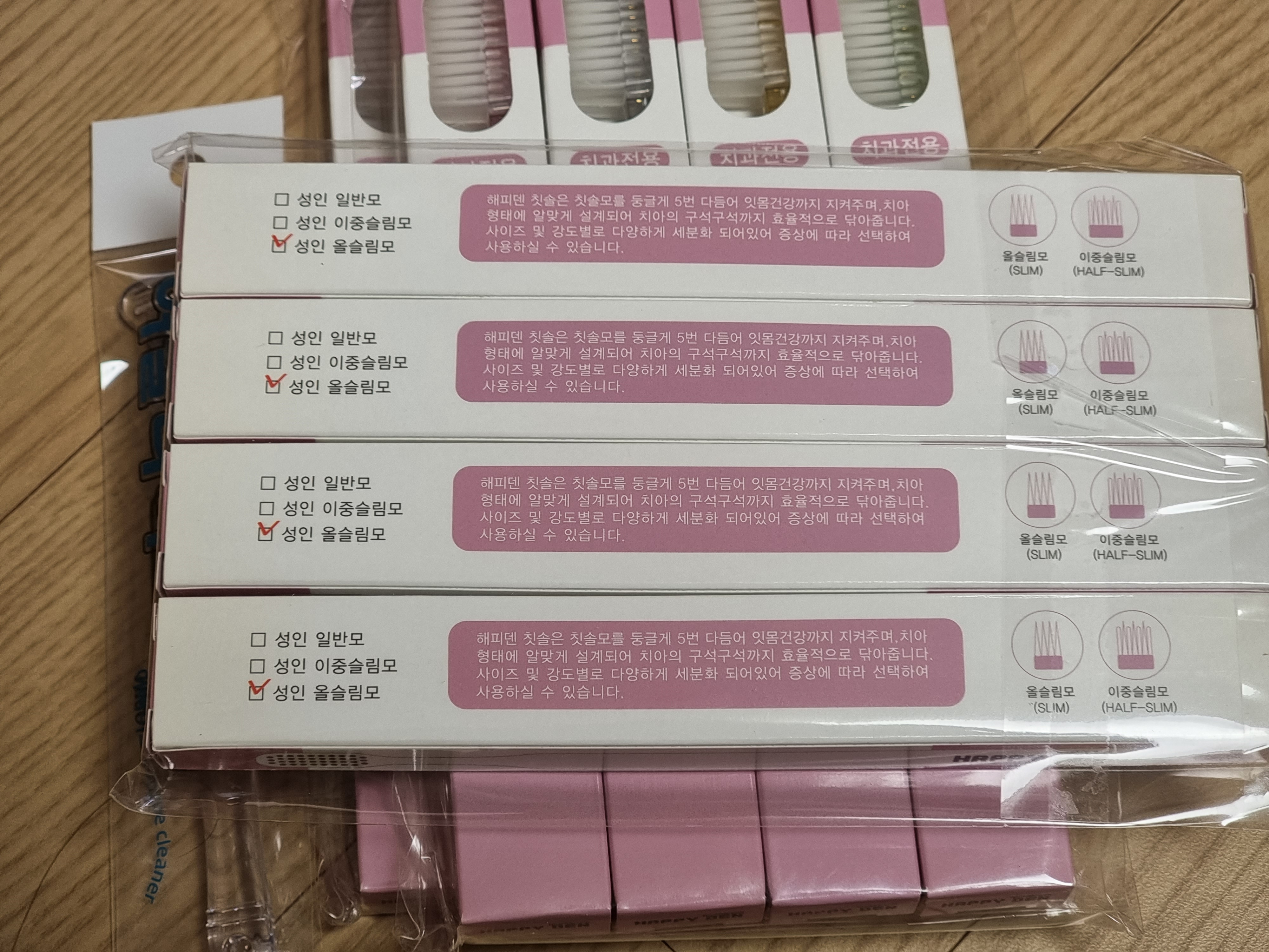 이번에 구매한 제품은 해피덴이라는 브랜드의 치과전용 칫솔 성인용 올슬림모 제품이다.