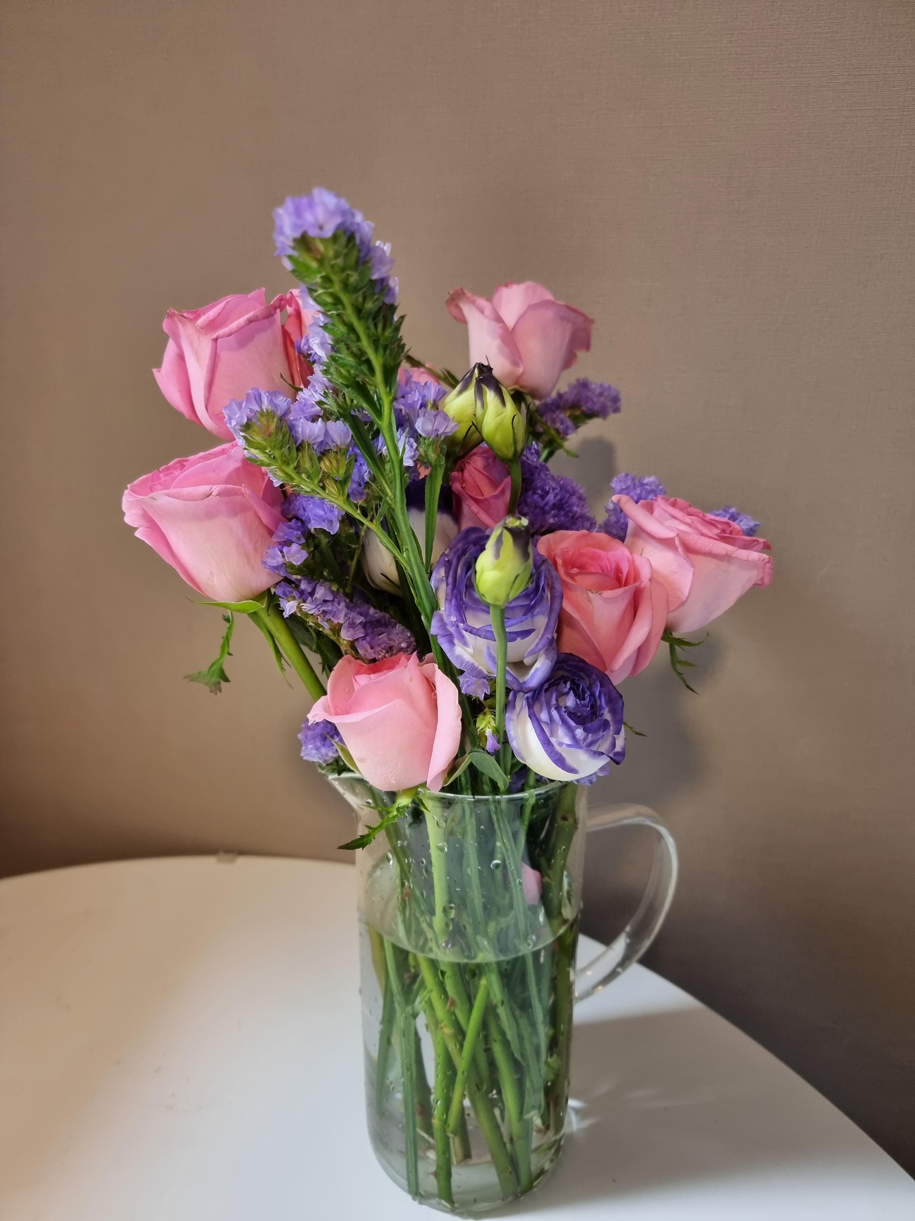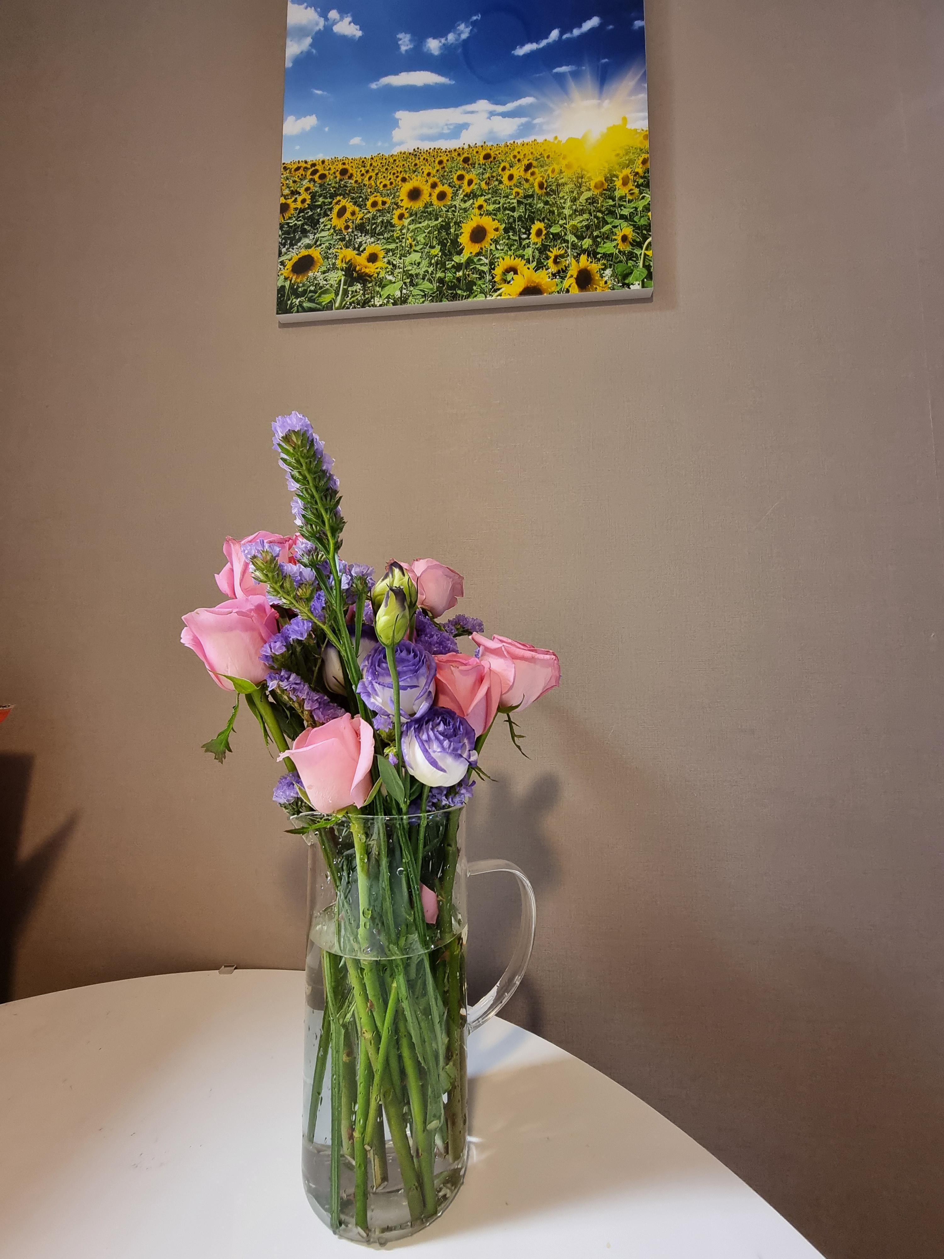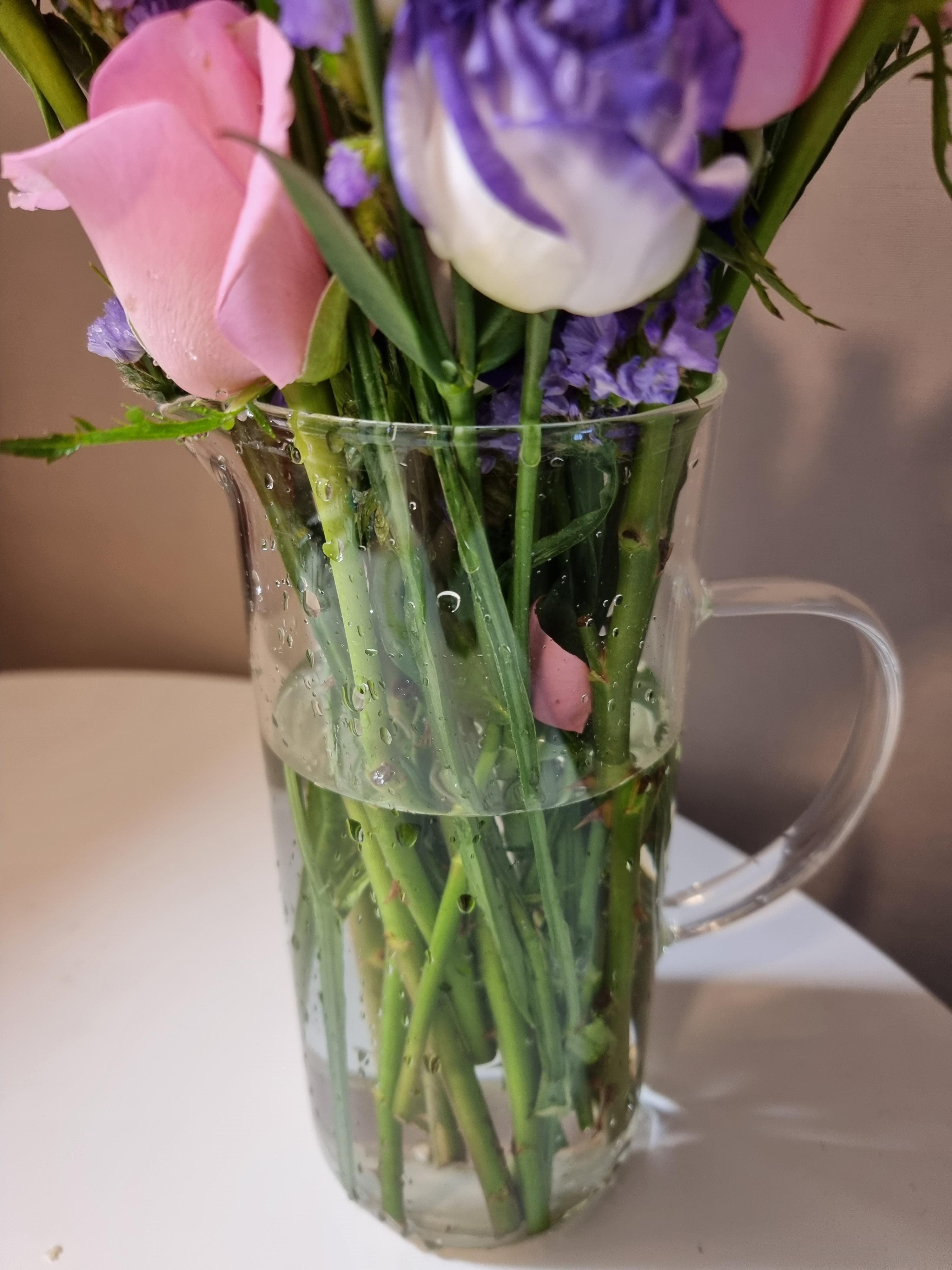 그 다음에 꽃병이나 컵 등을 이용해서 물을 넣고 꽂아주면 완성이다. 나는 꽃병이 없어서 유리로된 물통을 들고와서 물통에다가 임시로 꽂아주었다.