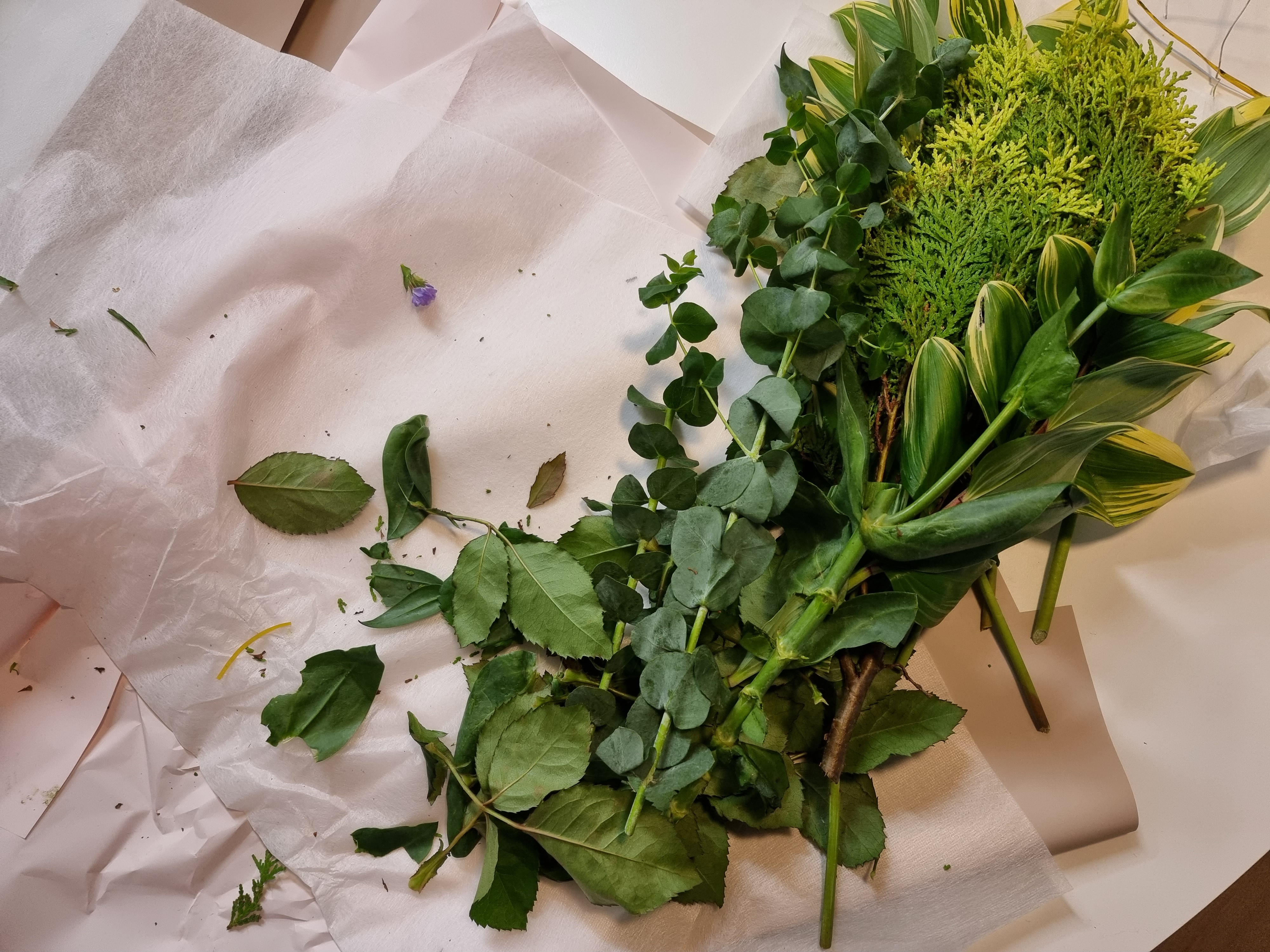 이파리들을 손으로 모두 떼어서 제거해준다. 꽃다발 선물을 처음 받아봐서 잘 몰랐는데 꽃다발을 예쁘게 보여줄 목적, 혹은 풍성하게 보여줄 목적으로 일반 줄기들도 꽤 들어있어서 이런것들도 모두 제거해주었다.