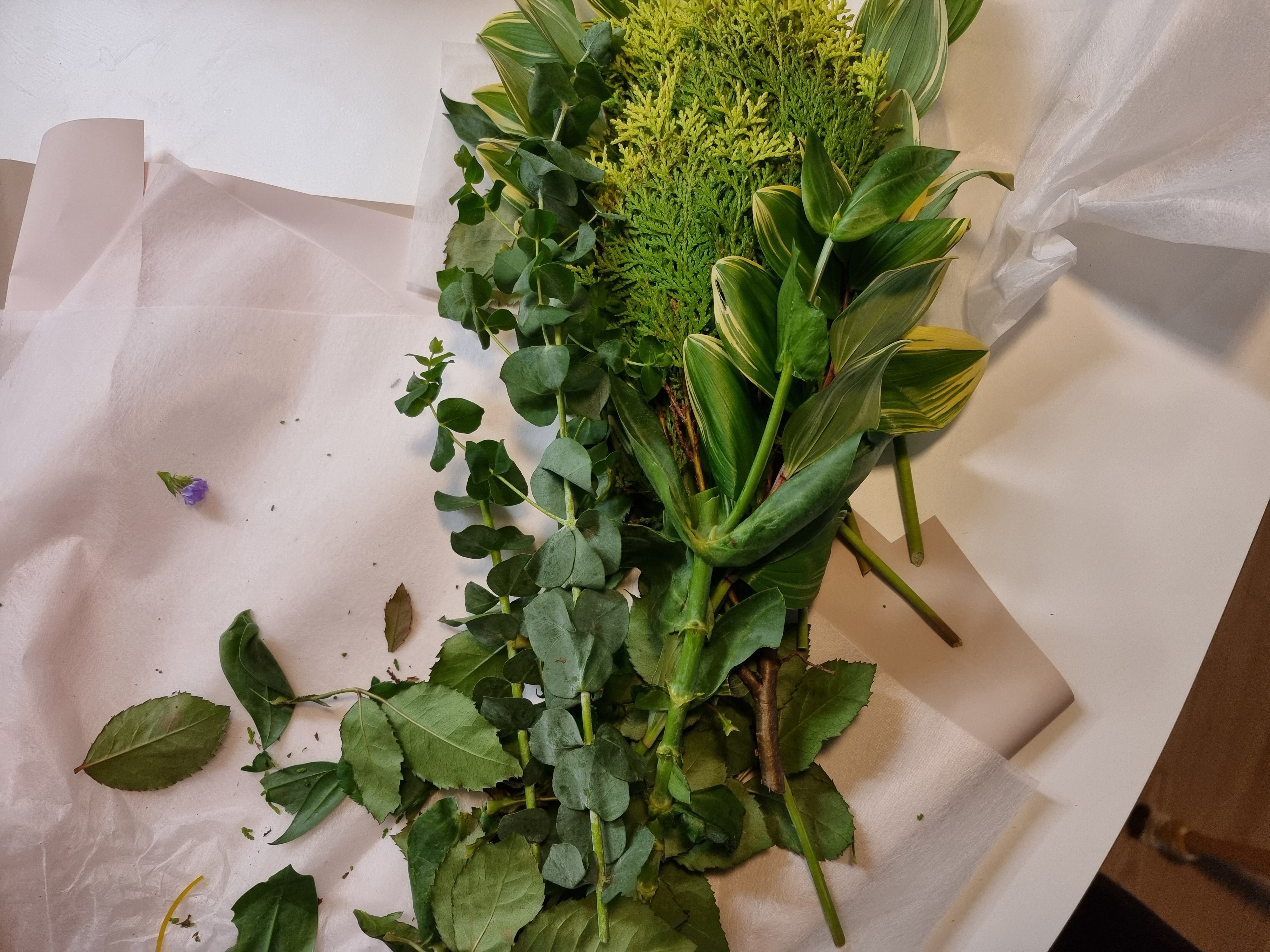 이파리들을 손으로 모두 떼어서 제거해준다. 꽃다발 선물을 처음 받아봐서 잘 몰랐는데 꽃다발을 예쁘게 보여줄 목적, 혹은 풍성하게 보여줄 목적으로 일반 줄기들도 꽤 들어있어서 이런것들도 모두 제거해주었다.